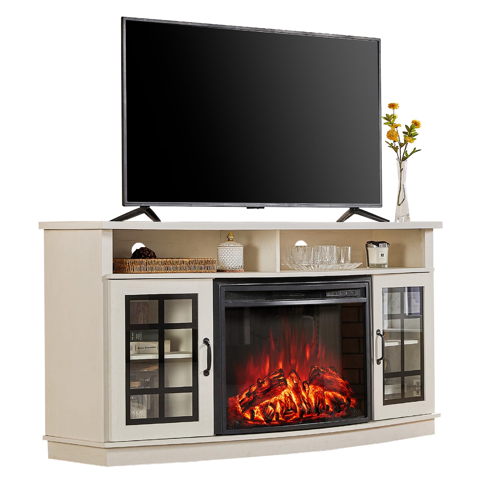 LUXOAK Curved TV Cabinet with 26" Electric Fireplace for TVs up to 65", Media Fireplace TV Console Table with Storage Farmhouse Glass Door, Distressed White
