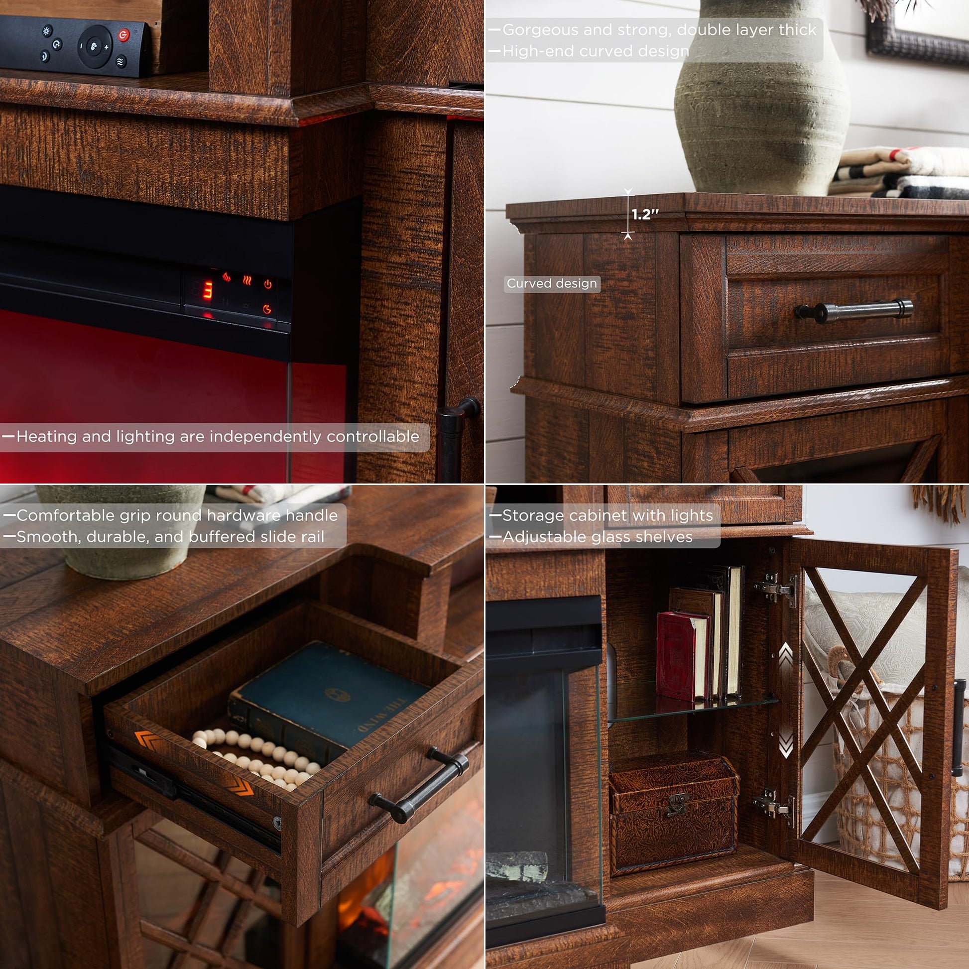 - Safe and Durable Crafted from MDF, it boasts double top panels and a thickened base for long-term sturdiness, Holds up to 300 lbs with ease. High-quality metal handles and hinges offer a cushioned anti-pinch function. Rest easy with our Fireplace Safety Guarantee, featuring overheat protection and ETL/FCC certifications. Elevate your home with this reliable and chic addition!