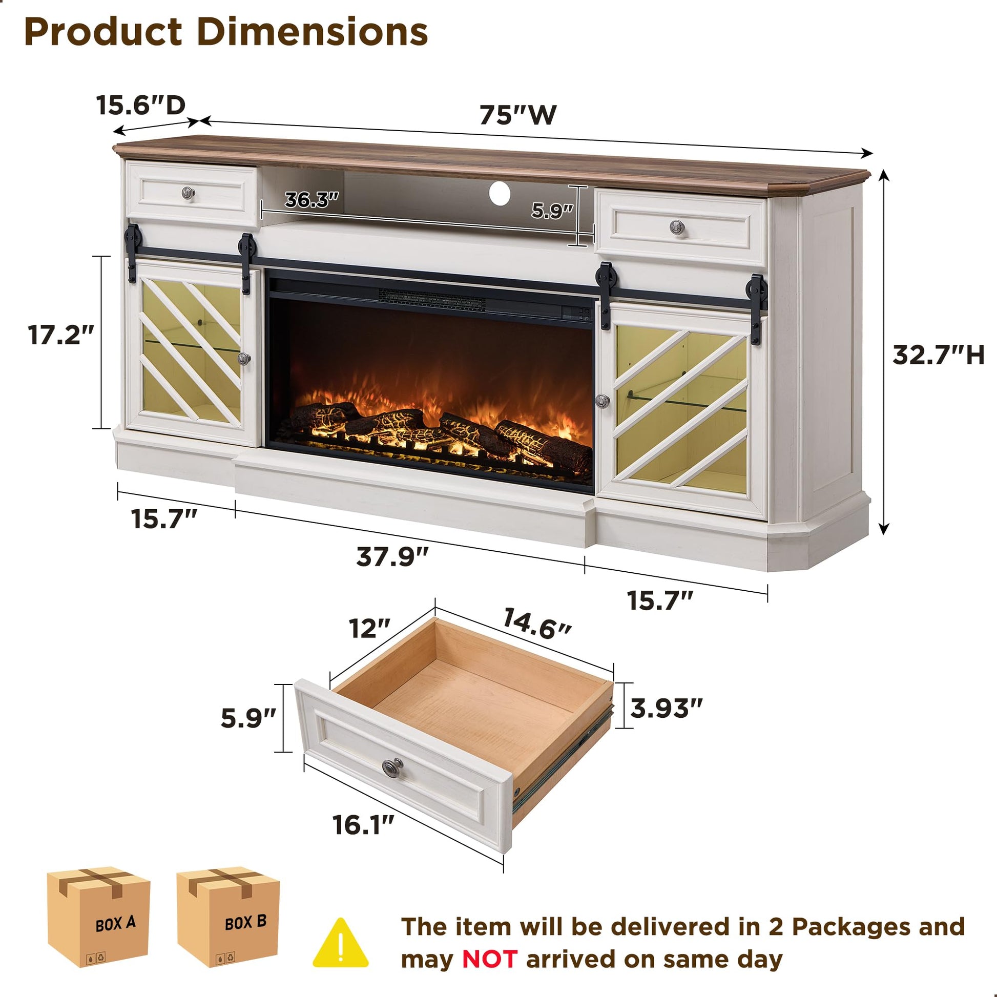 - Farmhouse Fireplace TV Stand: Measuring 75' W x 15.5' D x 32.7' H, this stylish and functional TV stand can accommodate TVs up to 85'. The included LED fireplace can be used with or without heat and features 7 different color light options.. Featuring a striking replicated oak finish and robust plank design, it adds a touch of rustic charm to your home. With ample storage space, it enhances your room’s cozy and welcoming atmosphere.