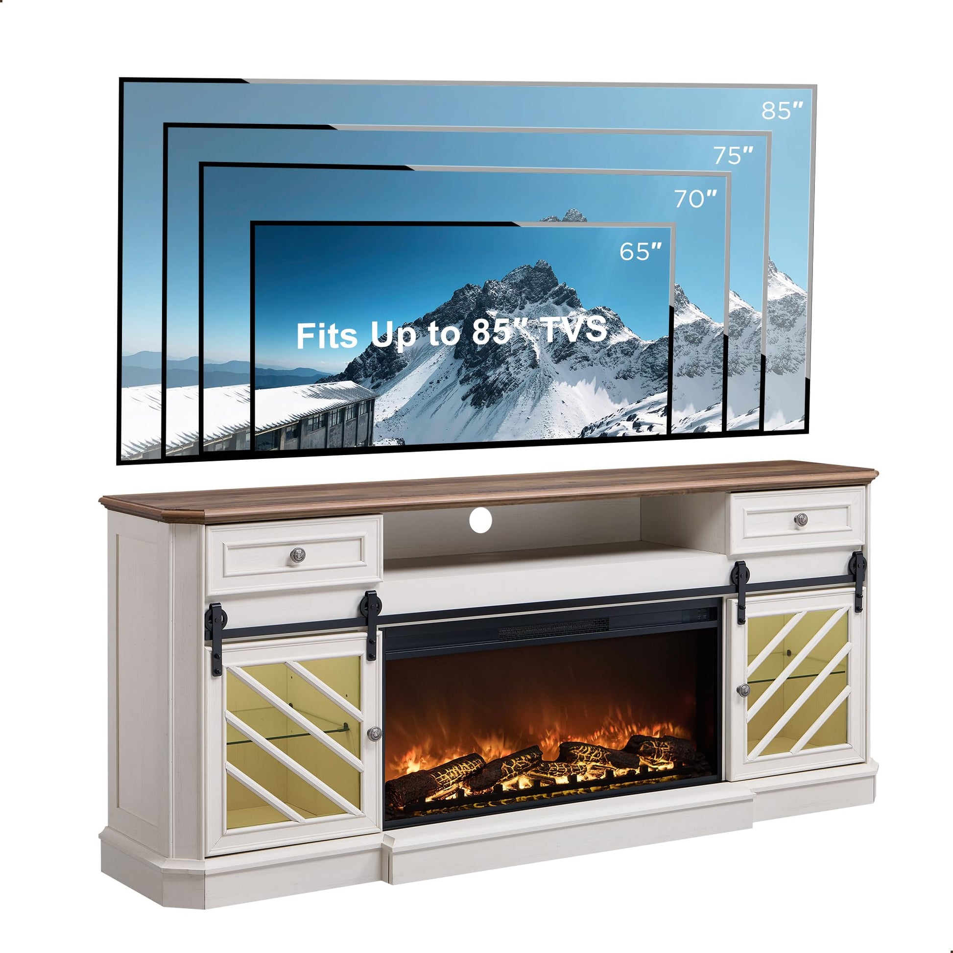 OKD 75” Fireplace TV Stand for 85 Inch TV, Farmhouse Highboy Entertainment Center with 36” Electric Fireplace, Modern Media Console Table with Drawers Storage&Cabinets for Living Room, Antique White