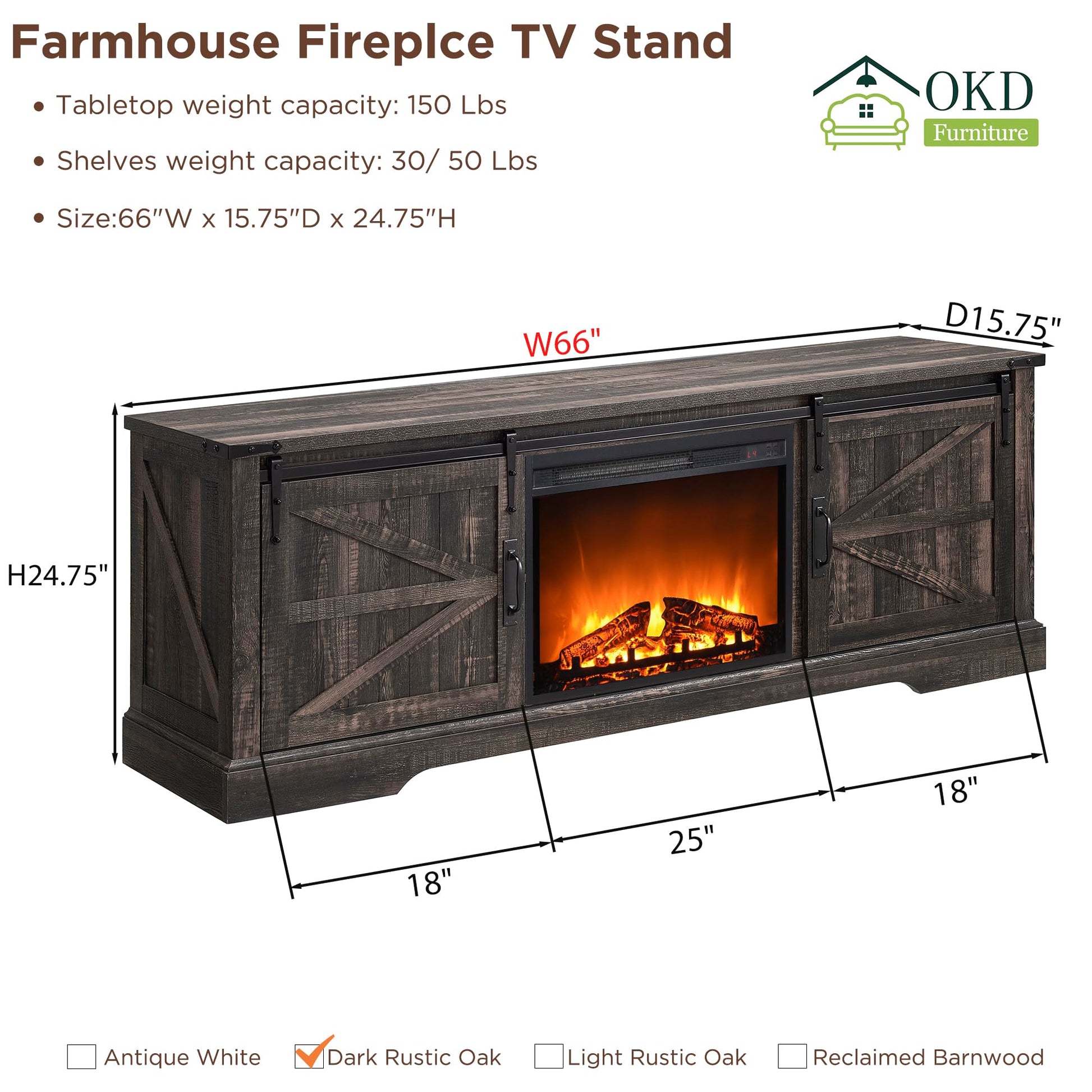 OKD Fireplace TV Stand for 70 75 Inch TV, 66 Inch Farmhouse Entertainment Center with 23" Electric Fireplace, Remote Control, Large Rustic Media Console Cabinet with Sliding Barn Door, Dark Rustic Oak