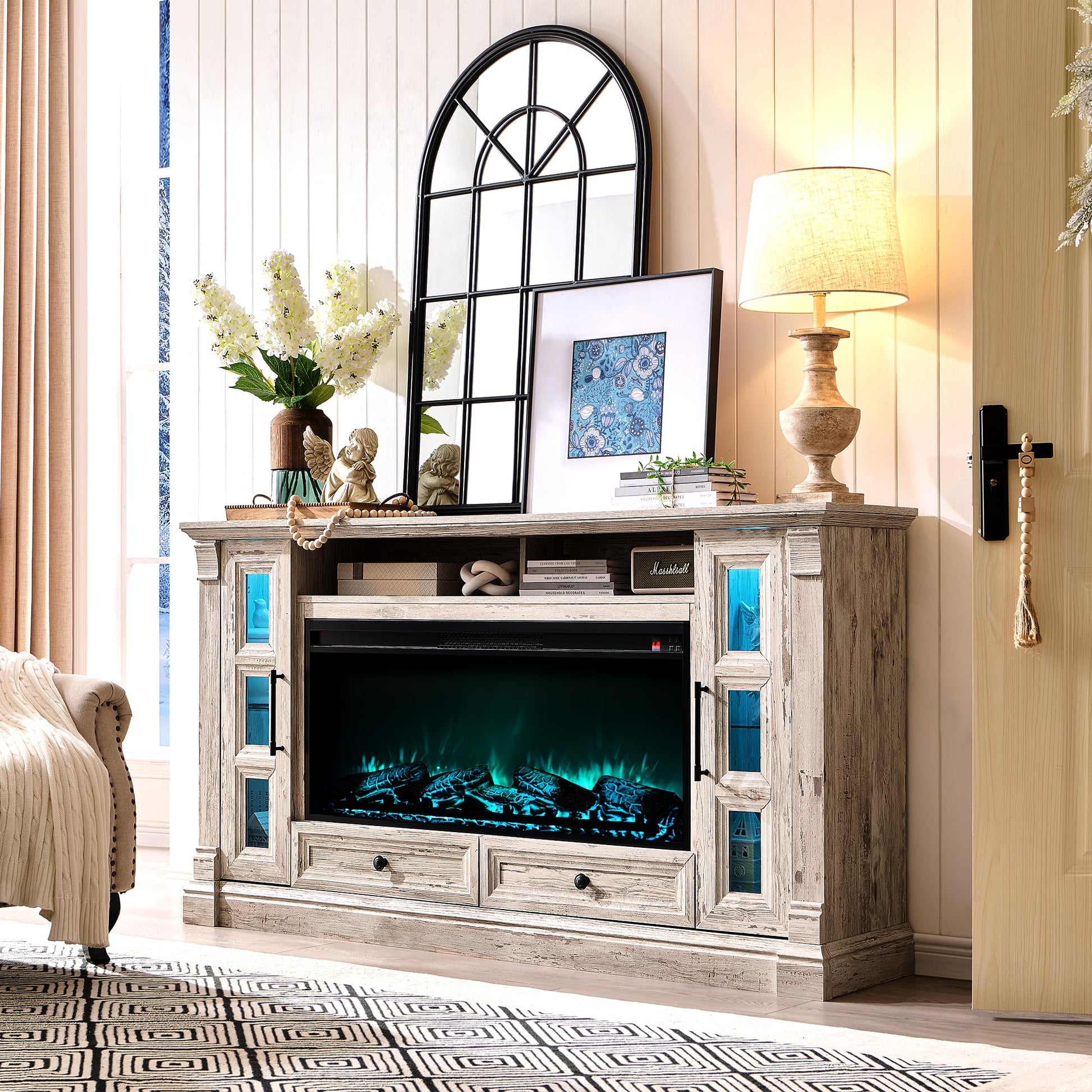 • [Rustic Elegance for Your Space]: This 70' fireplace TV stand is your dream room retreat. Decorative corbels and framed fronts with clear glass inset add refinement. The antiqued aesthetic blends with a weathered distressed wood finish for added charm. Enhancing the experience, paired with an upgraded 42' fireplace brings a touch of warmth and beautiful ambiance to your living room. An infusing embodiment of beauty and practicality in your home, it'll entice everyone