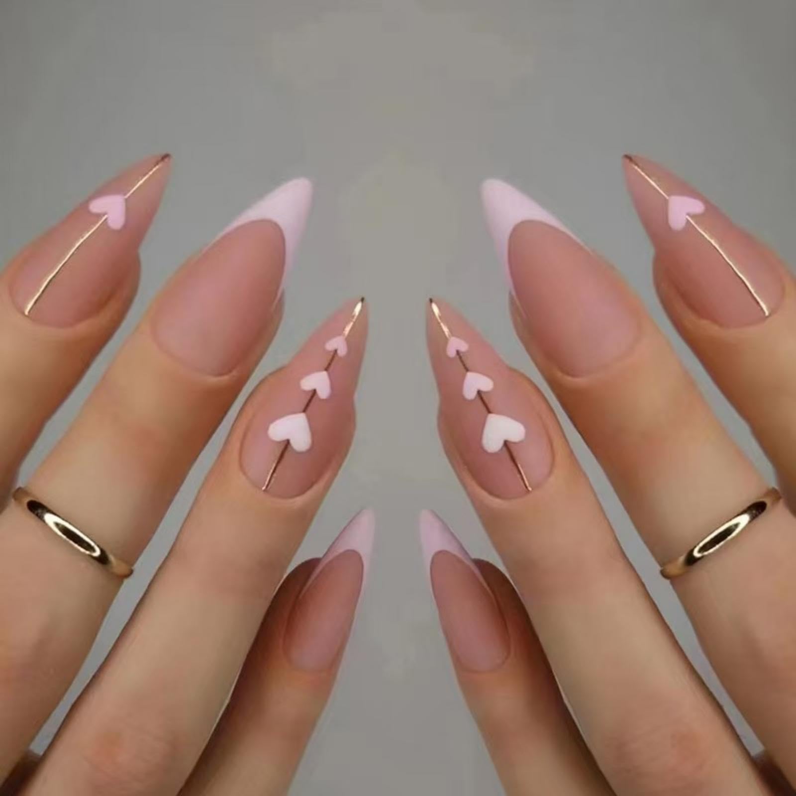 Pink French Tip Press on Nails Heart Fake Nails with Gold Line Design Love Glue on Nails Glossy Acrylic Full Cover Nude Pink Stick on Nails Medium Stiletto False Nails for Women Manicure