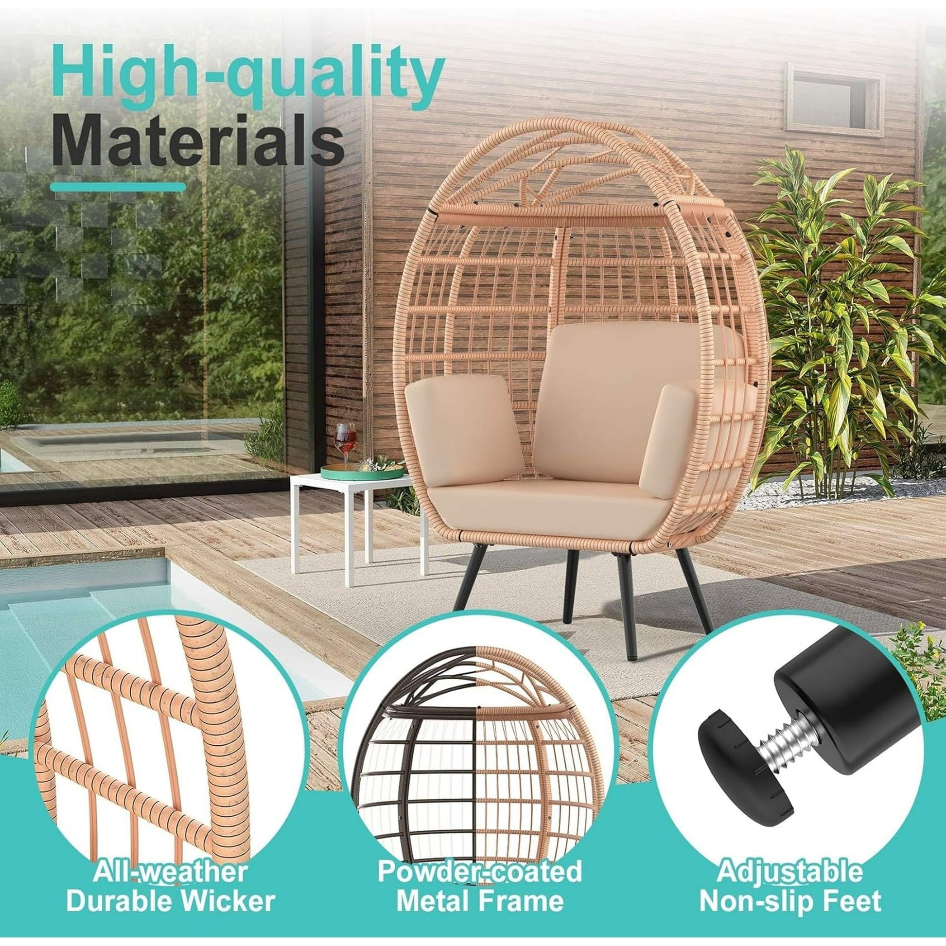 PNKKODW Wicker Standing Egg Chair w/ UV Cushions & Storage Bag, 370lb Capacity, Boho Egg Lounger for Indoor/Outdoor, Brown-Brown