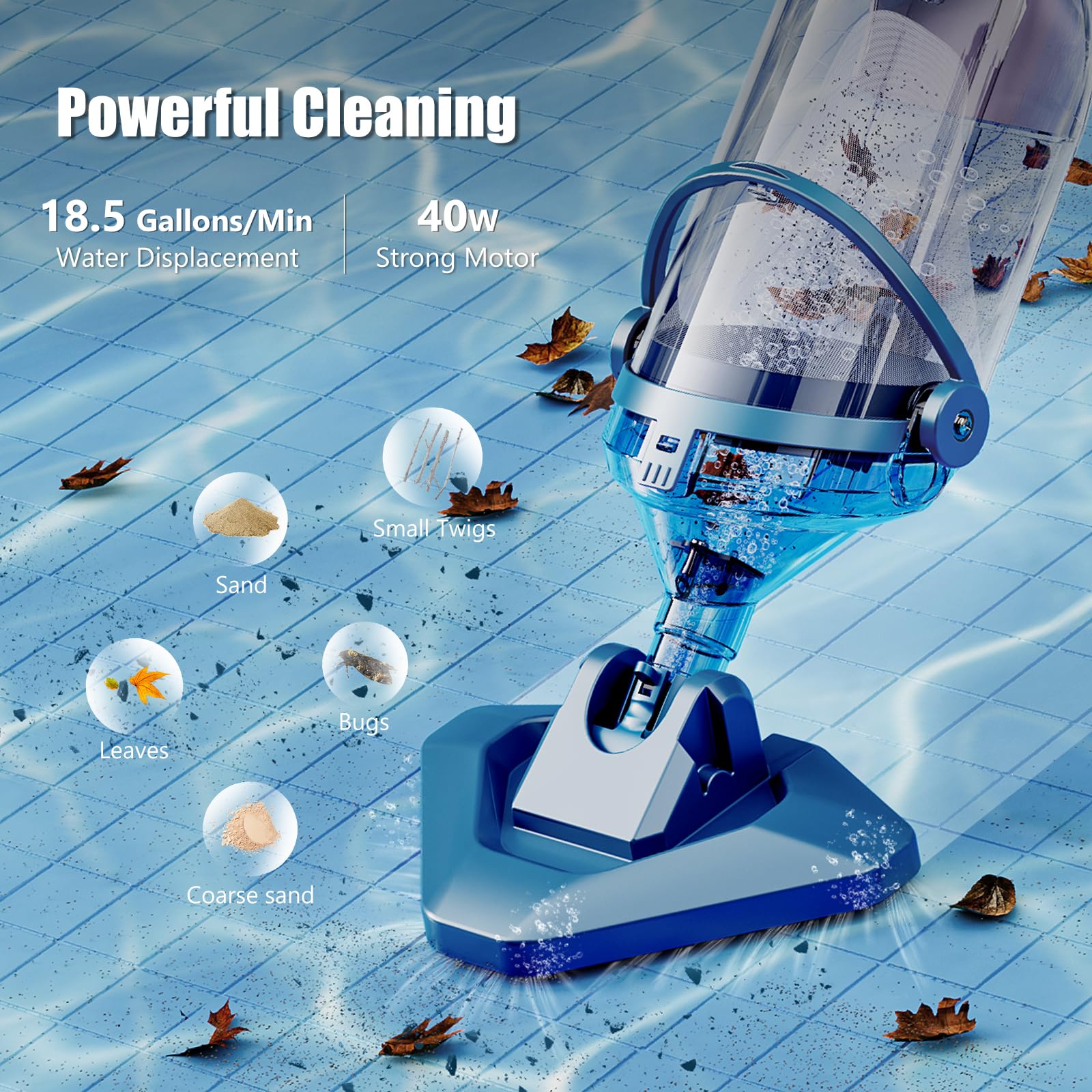 - 【EASY OPERATION】Simply attach the pool vacuum to the appropriate handle, turn the pool vacuum on, submerge the water outlet of the unit and you are ready to vacuum as you do on the floor. The filter screen can be removed for cleaning. Tool-free assembly, easy and convenient