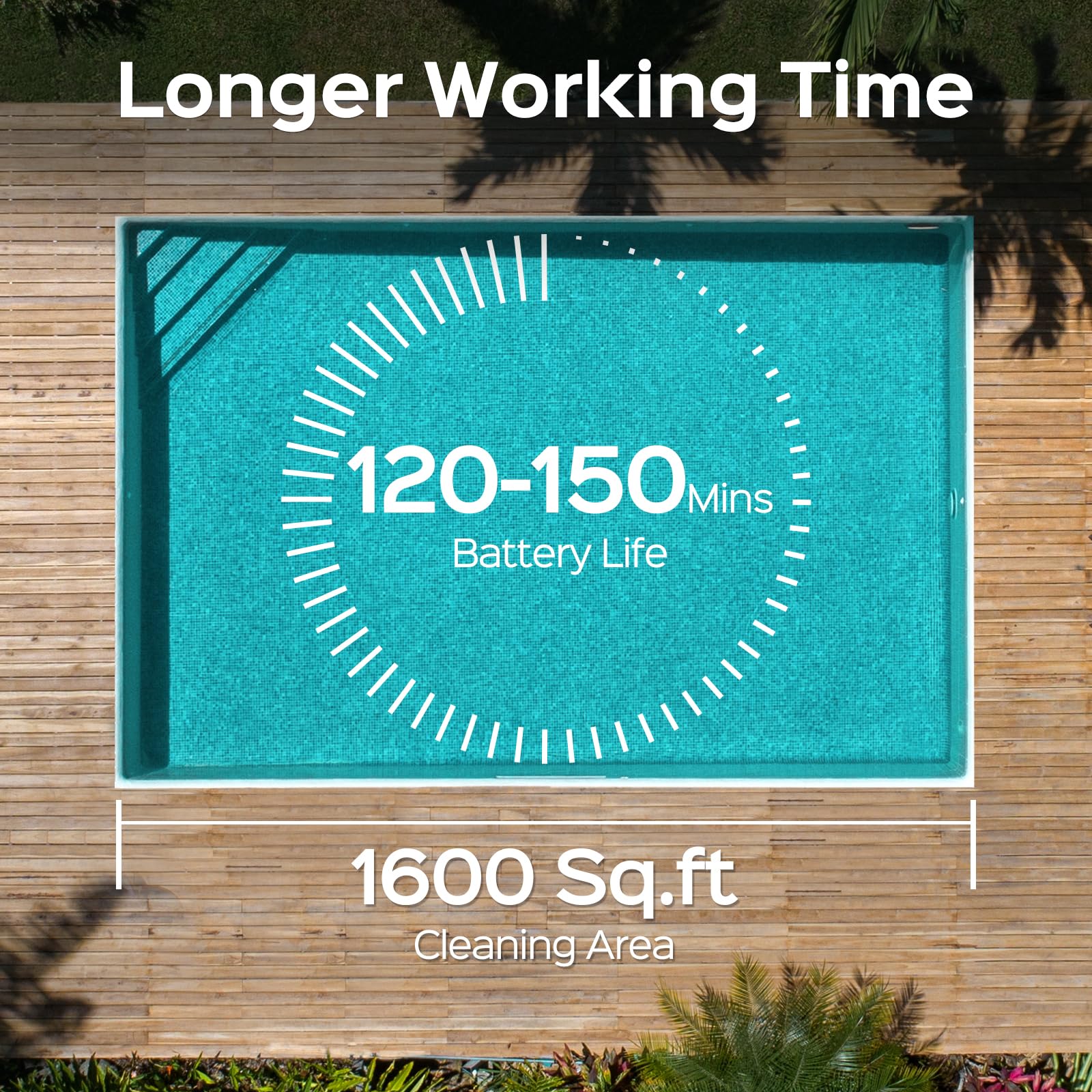 - 150 MINUTES LONG RUN TIME: The pool vacuum can be fully charged in just 3 hours. Features 2 individual brushes that operate independently for precise rotation control and greater coverage. For in-ground pools up to 65 feet and 9.8 feet deep.