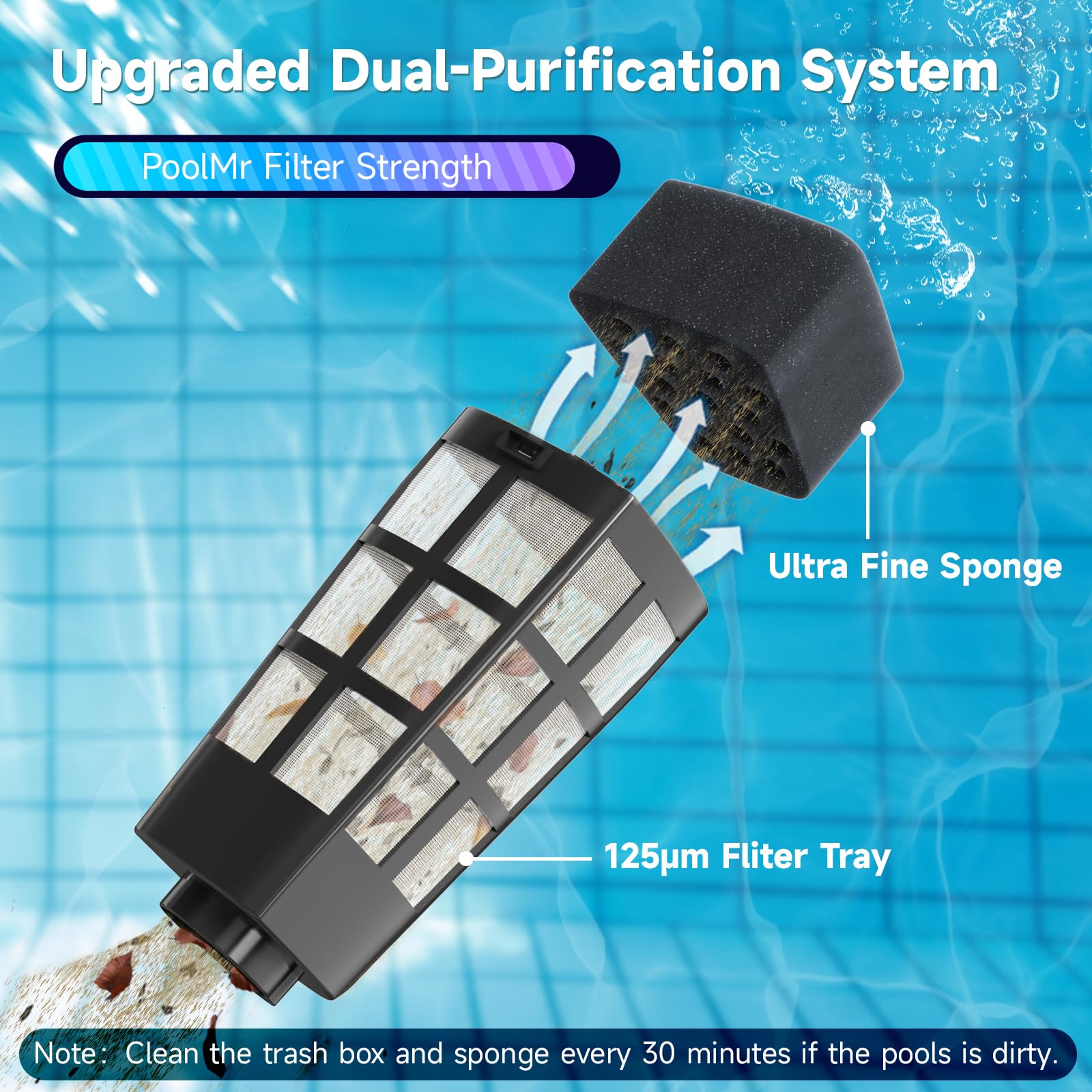 - Dual-phase Cleaning System: Designed for maximum efficiency, this pool vacuum features a dual-phase cleaning system. The 125μm mesh trash box traps leaves, twigs, and large debris, while the 250μm pool sponge captures fine particles like sand and silt. Whether tackling heavy debris or fine sediment, this system ensures a thorough and adaptable cleaning experience