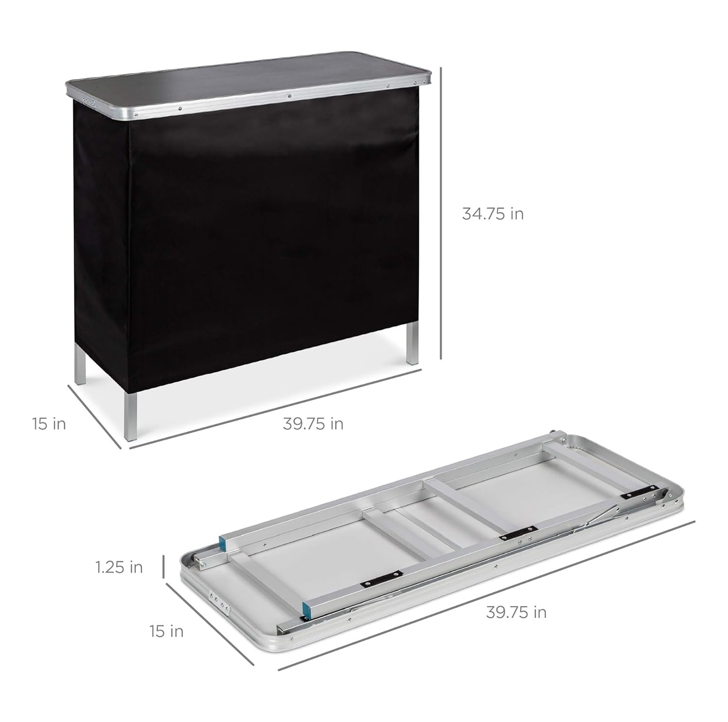 Introducing our Portable Pop-Up Bar Table, the ultimate solution for your indoor and outdoor entertaining needs. Designed with convenience and versatility in mind, this table is the perfect addition to your next party, picnic, tailgate, or trade show. Take it anywhere with ease! The foldable design and included carrying case make transporting this table a breeze. Simply pack it up and bring the party wherever you go. It's a must-have for those who love to entertain on the move.This multipurpose table is built compact but sturdy, with a remarkable 110-pound weight capacity. Whether you're mixing drinks, displaying goods, or serving up delicious entrees at your next potluck, this table can handle it all. It's the perfect blend of functionality and style.No need to worry about using it indoors or outdoors. The aluminum frame is designed to withstand the elements, ensuring durability and longevity. The water-against nylon privacy cover, making it suitable for any environment.Store and cover your equipment, tools, and accessories effortlessly with the removable privacy skirt. The self-adhering nylon cover is secured by a set of touch fasteners, keeping your items neatly stored and out of sight. It's the ideal storage solution for a clutter-free space.Setting up this folding table is a breeze. With a quick, tool-free setup, you'll be ready to entertain in just three simple steps. Spend less time on assembly and more time enjoying your event.The overall dimensions of the table are 39.75'(L) x 15'(W) x 34.75'(H), providing ample space for your entertaining needs. The table has a weight capacity of 110 lbs., while the shelf can hold up to 66 lbs. You can be confident in its strength and durability.