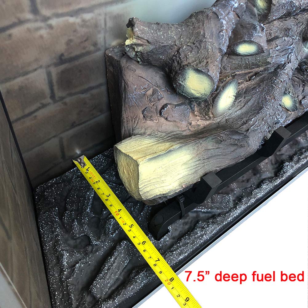- Life-like resin log which is 11 13/16' high sitting on the grate above ember bed, that's just what a wood burning fireplace looks like. Traditional antique design with three-sided interior brick wall, glass door and mesh screen makes it more realistic but without the hassle of cleaning dust or ashes.