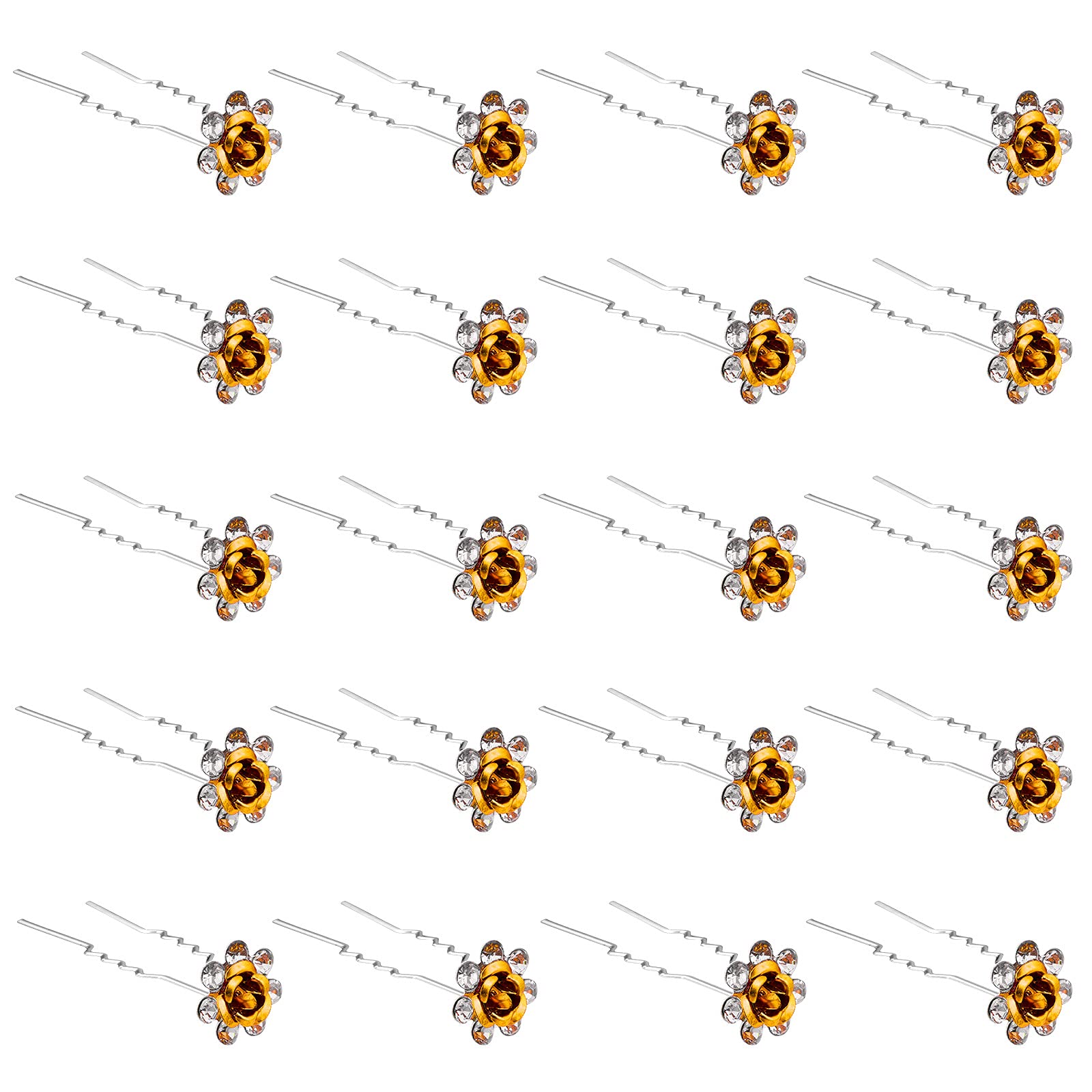 QIUTIMIY 20 Pack (Yellow) Crystal Hair Pins Rose Flower Rhinestone Hair Clips for Bridal Wedding Women Hair Jewelry Accessories, with Clear Container
