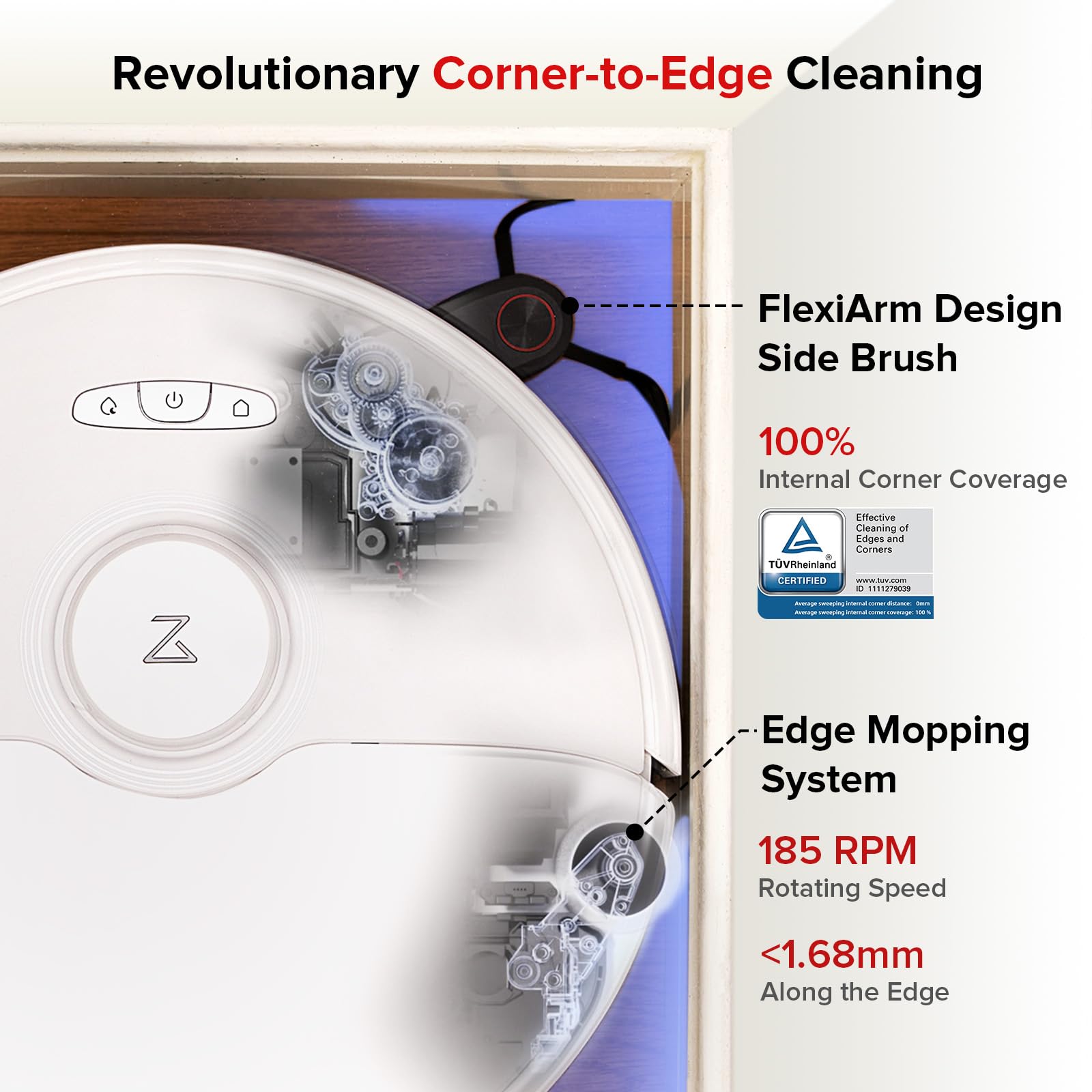 - Advanced FlexiArm Design - Roborock's FlexiArm extends the side brush to reach concave corners with 100% coverage and hard-to-reach spaces under furniture. Coupled with the Extra Edge Mopping System, it achieves precise edge cleaning with a cleaning precision of less than 1.68mm.