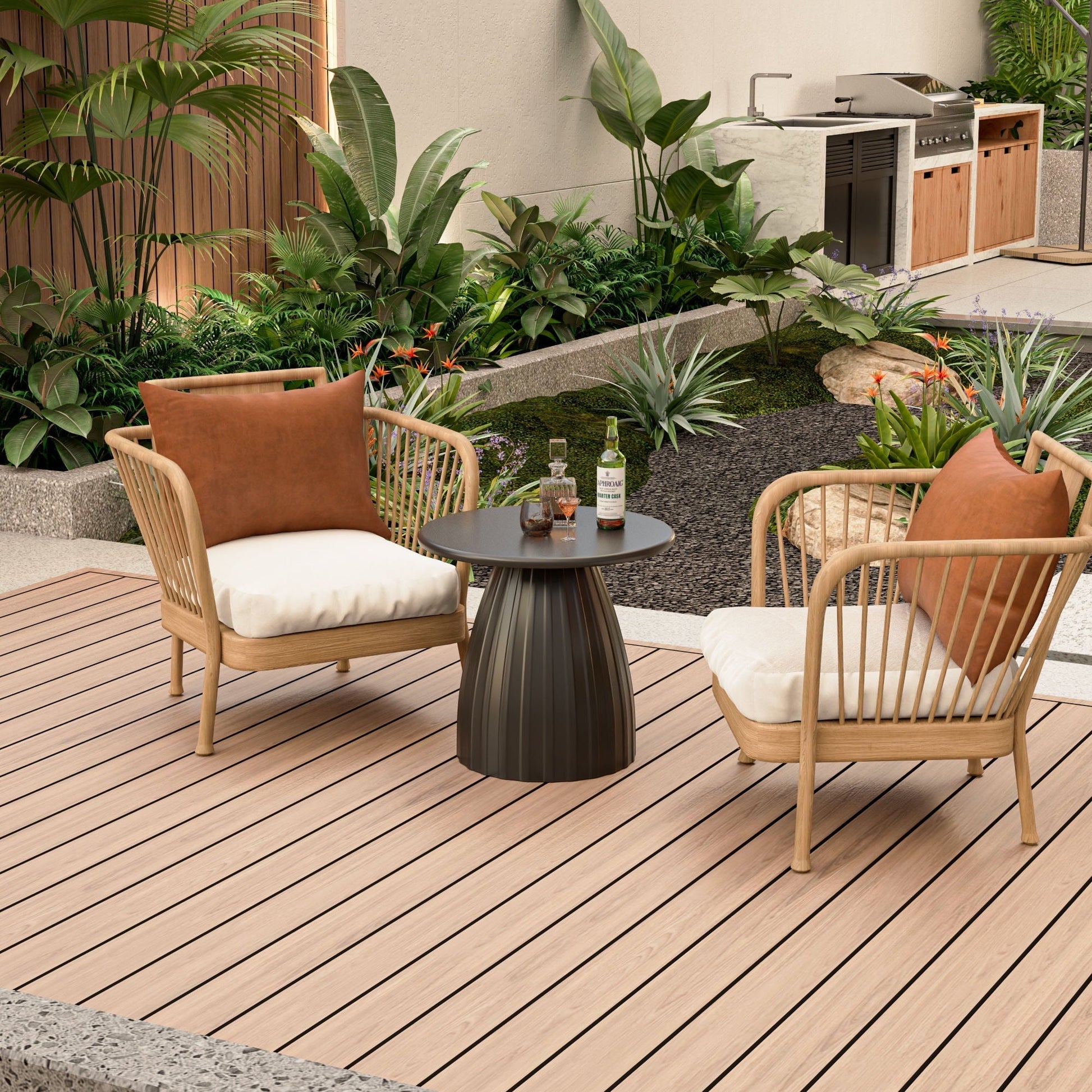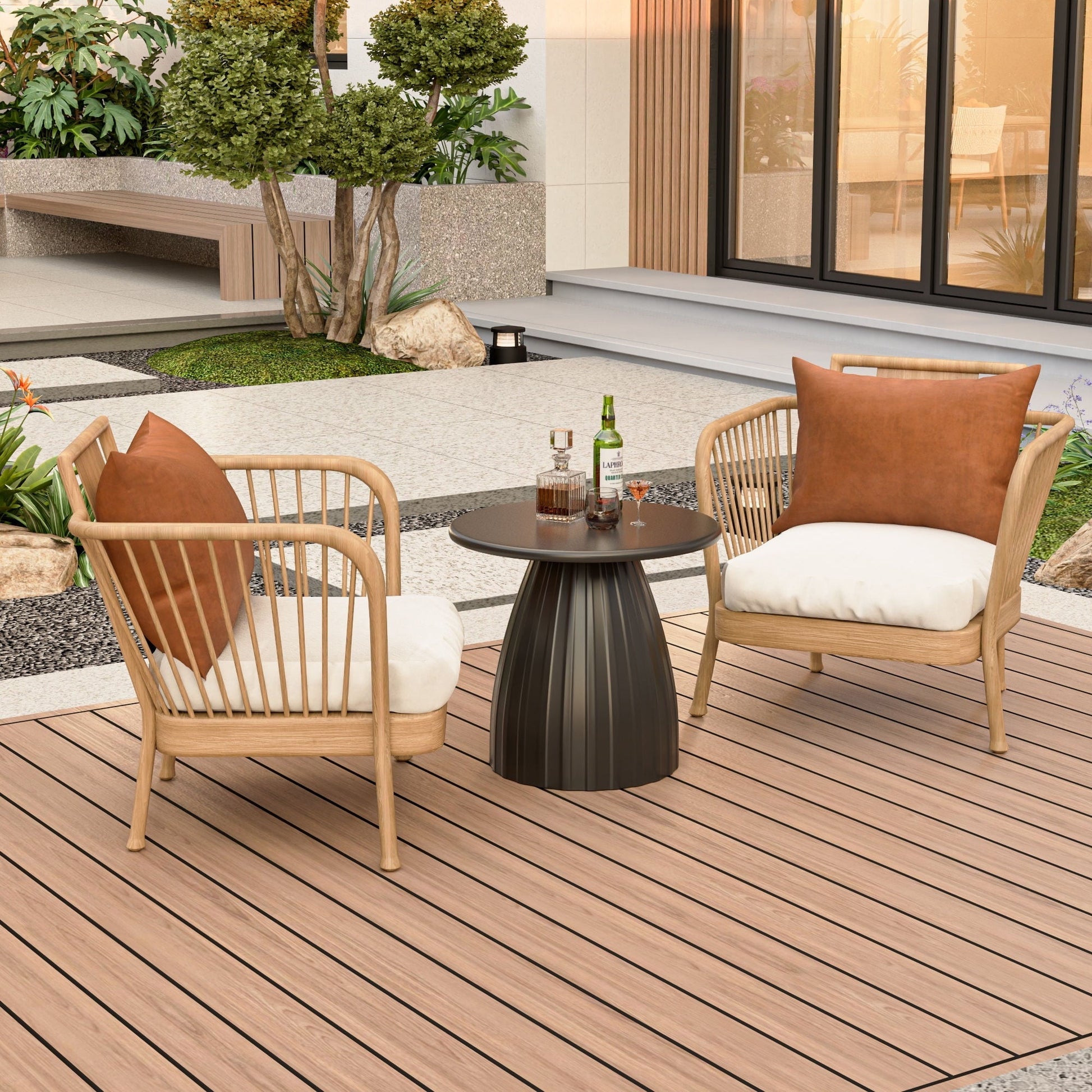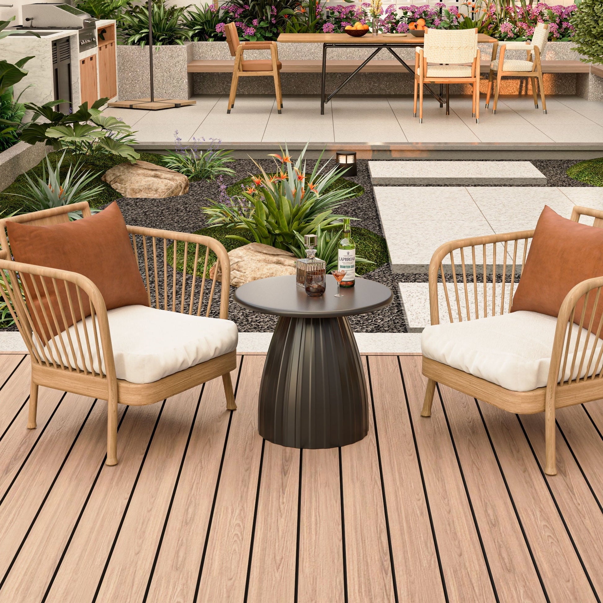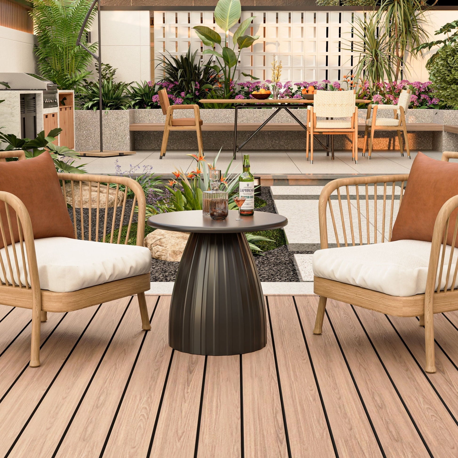 This stylish and elegant round metal outdoor patio side table features a fluted base that adds a touch of sophistication to any patio or poolside setting. Crafted from durable and weather-resistant metal, this versatile side table can be used indoors or outdoors as a corner, accent, or display piece. With its smooth round tabletop, it provides ample space for drinks, snacks, or decorations. The one-piece design requires no assembly, and the tabletop is easy to clean and maintain. This outdoor accent table enhances the overall atmosphere of your outdoor living space, whether you're hosting a pool party or enjoying a quiet evening under the stars.