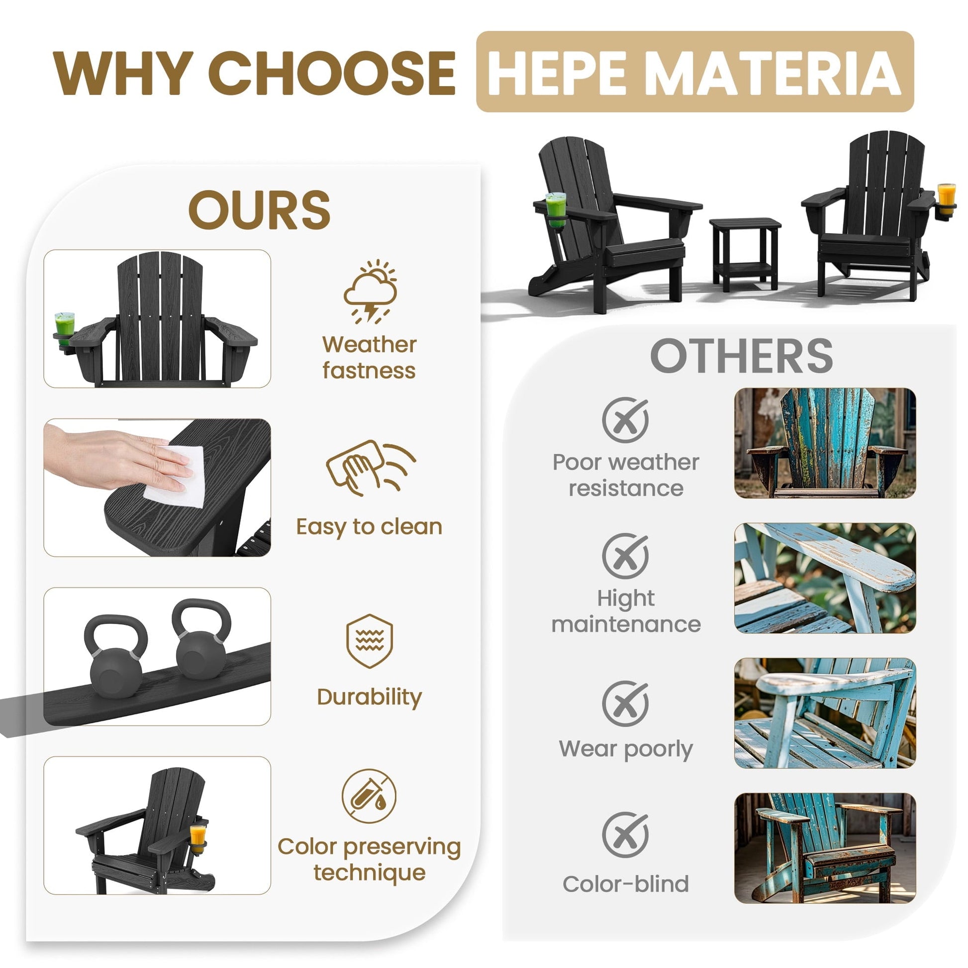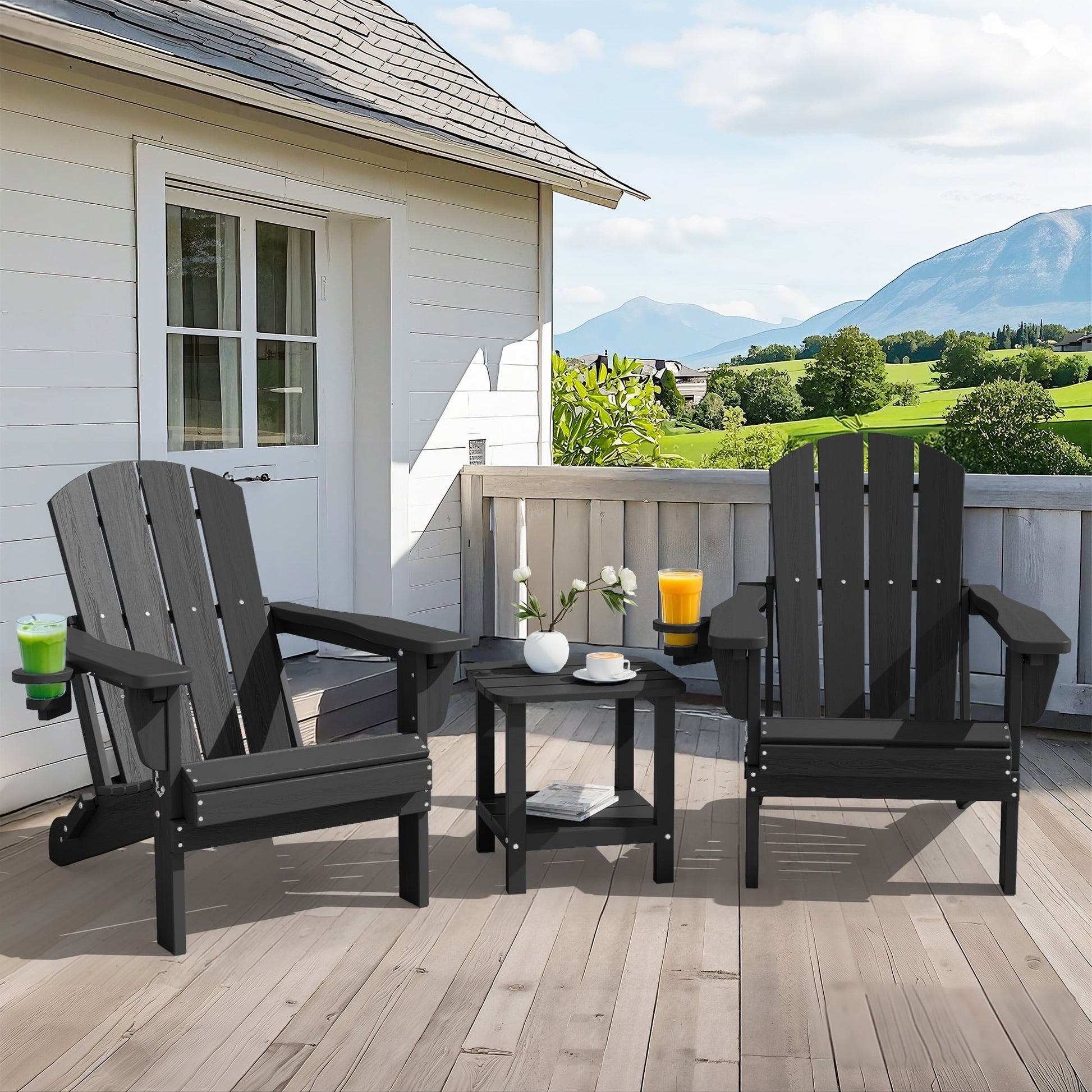 Relax in style with the SERWALL 3PC Adirondack Set, including 2 Reclining Chairs and 1 Double Side Table. The folding chairs feature 3 adjustable recline positions and ergonomic design for personalized comfort, each equipped with a convenient cup holder, wide armrests, and contoured seat. Crafted from durable HDPE material, the weather-resistant set withstands outdoor elements with low maintenance. Perfect for patios, balconies, gardens, beaches, or camping, the foldable design offers easy storage. Available in classic colors, this set seamlessly blends functionality and style for any outdoor space.