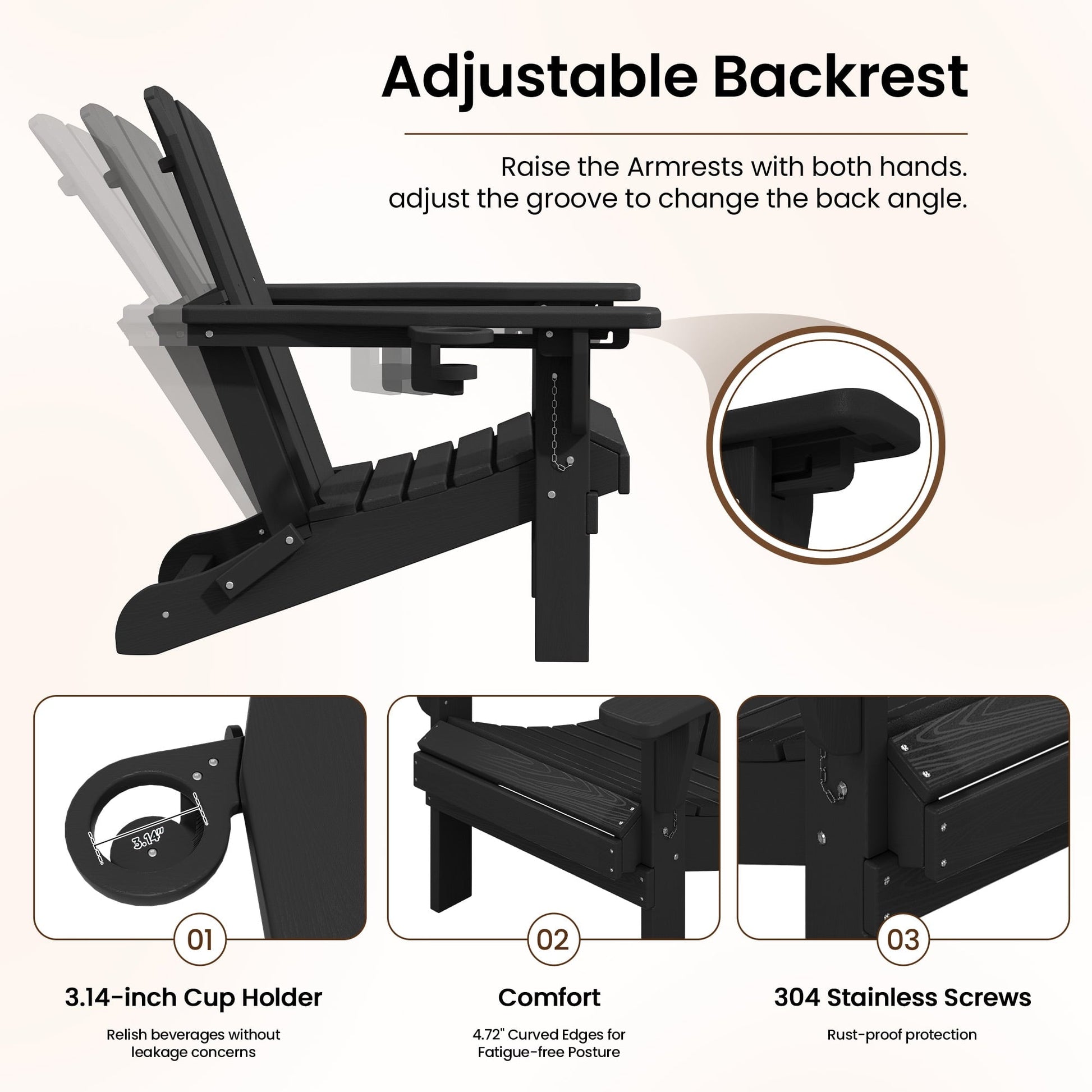 SERWALL 3PC Adjustable Folding Adirondack Chair set and Double Side Table, For Outdoor, Patio, Poolside, Garden, Black