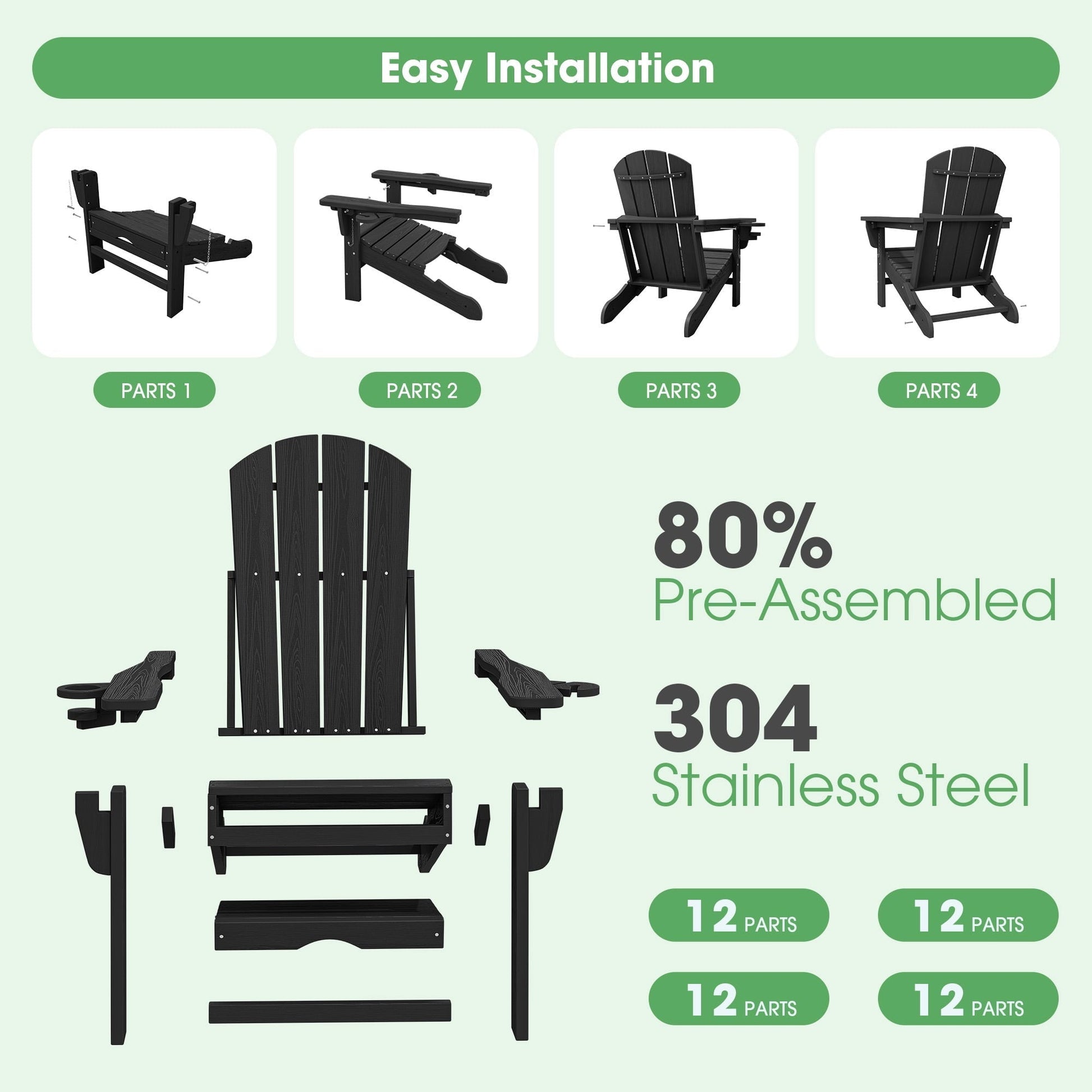 SERWALL Adjustable Folding Adirondack Chair with Footrest & Dual Cup Holders, HDPE Foldable Multifunctional Adirondack Chair with Ottoman for Patio, Outdoor, Garden, Black