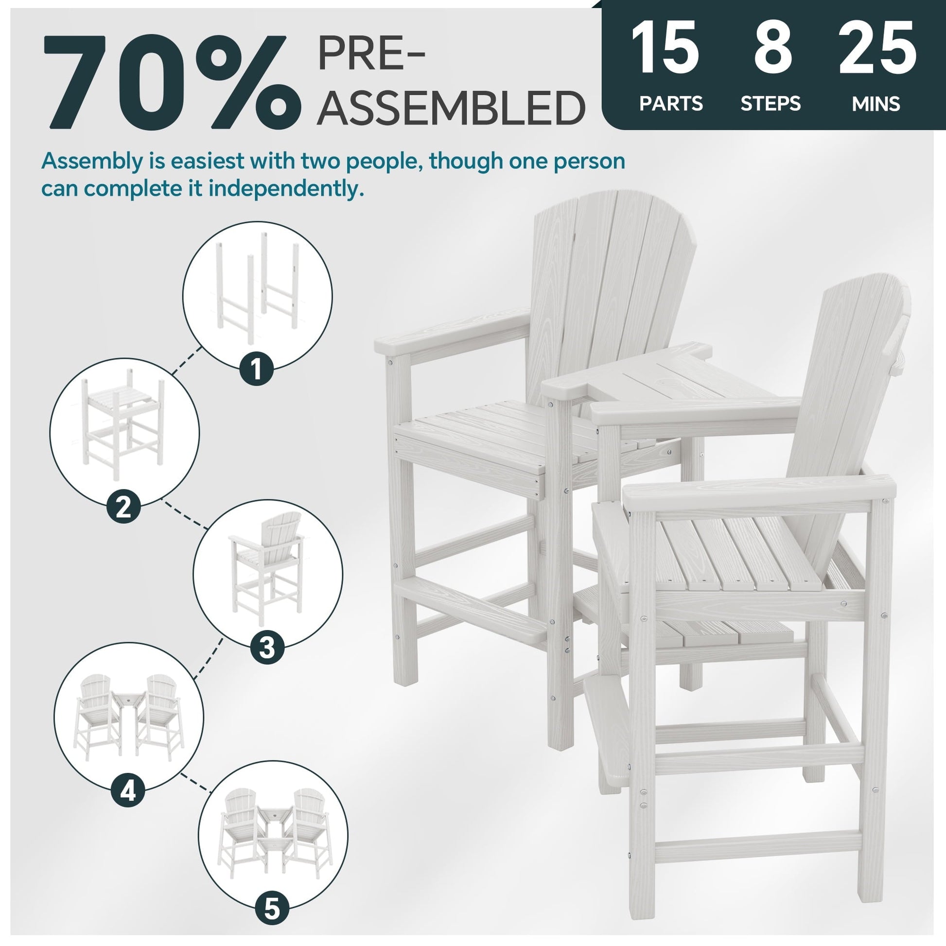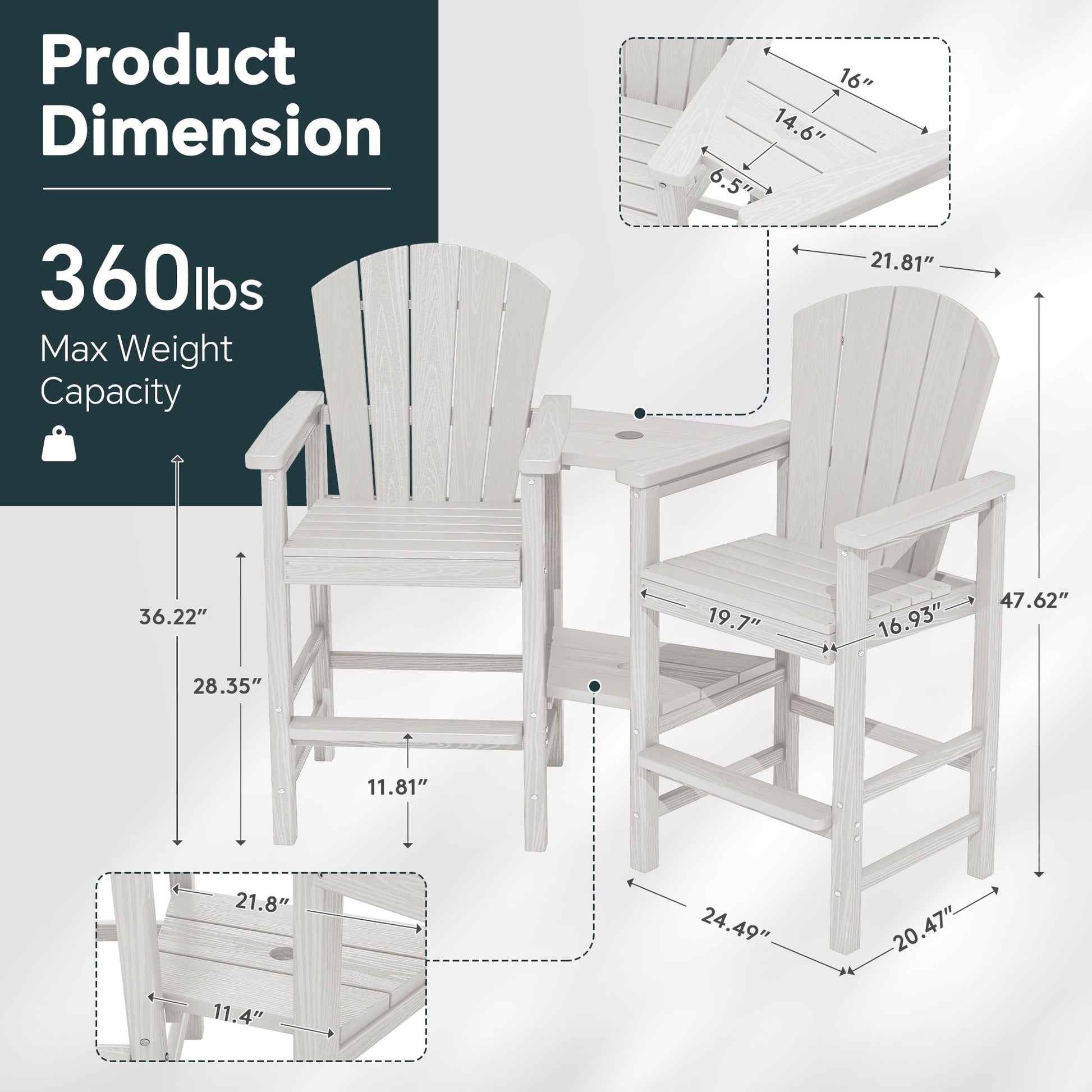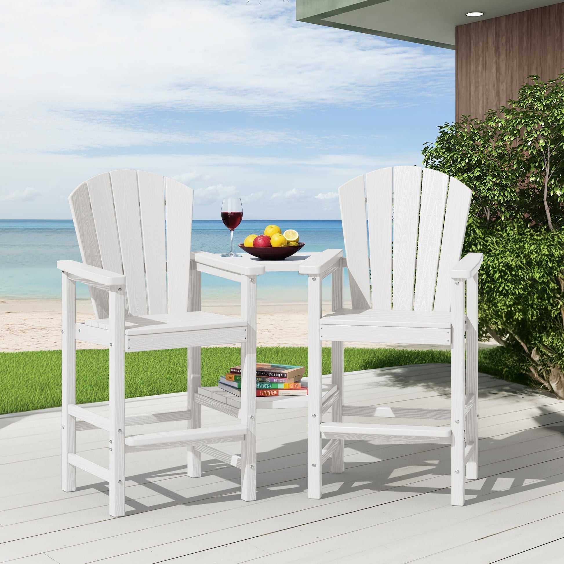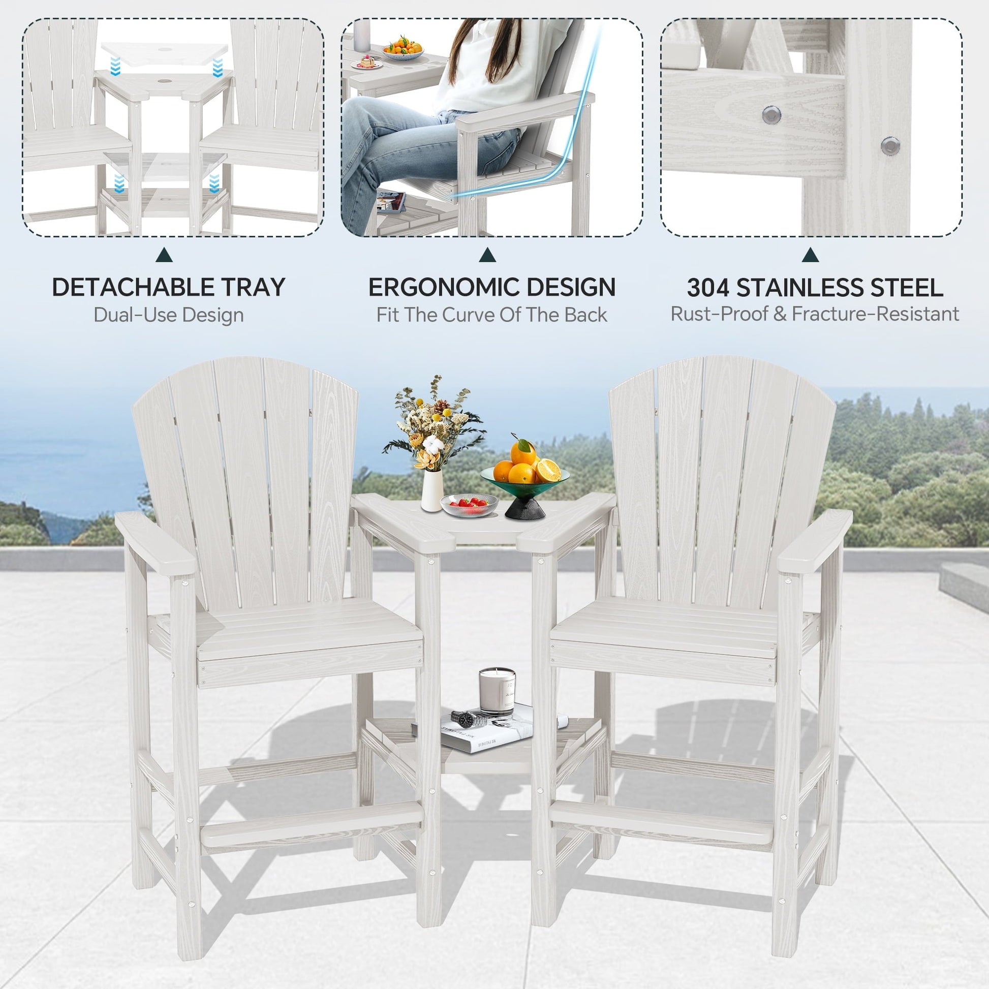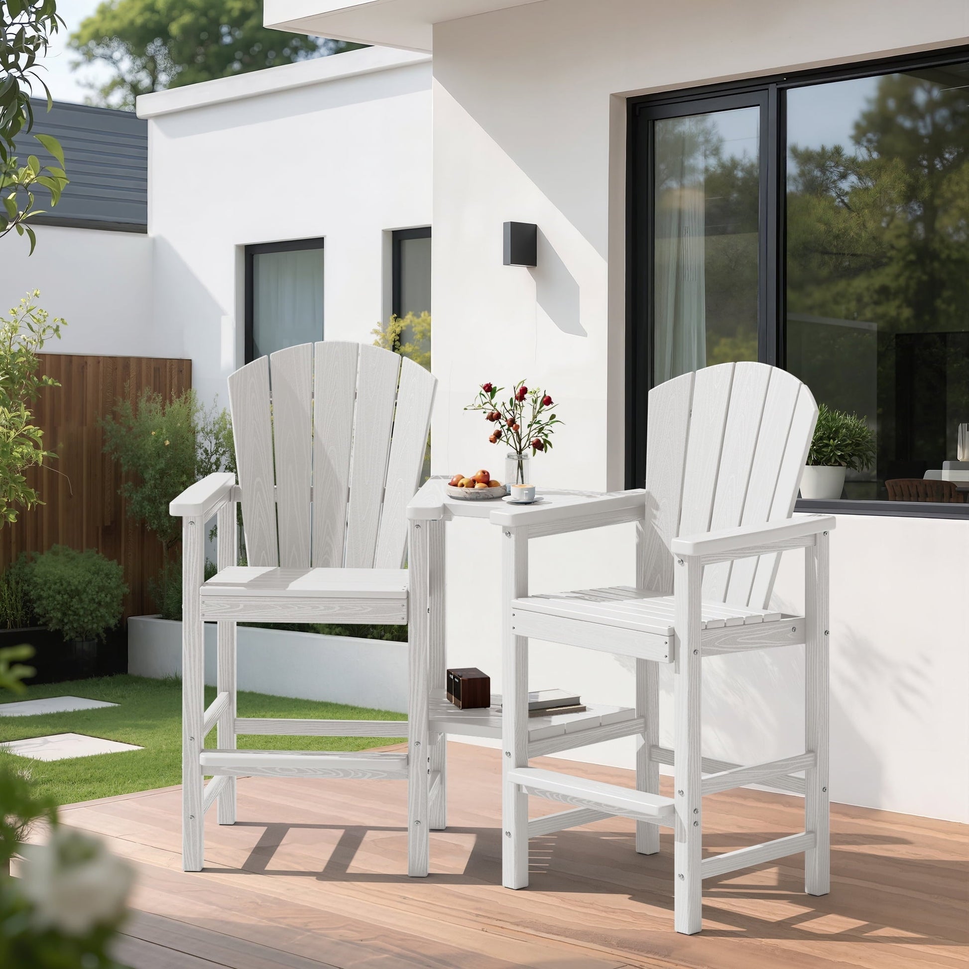 SERWALL Tall Adirondack Chairs Set of 2 with Double Layer Connecting Tray, HDPE Bar Height Outdoor Chairs, for Patio, Balcony, Porch, Pool, White