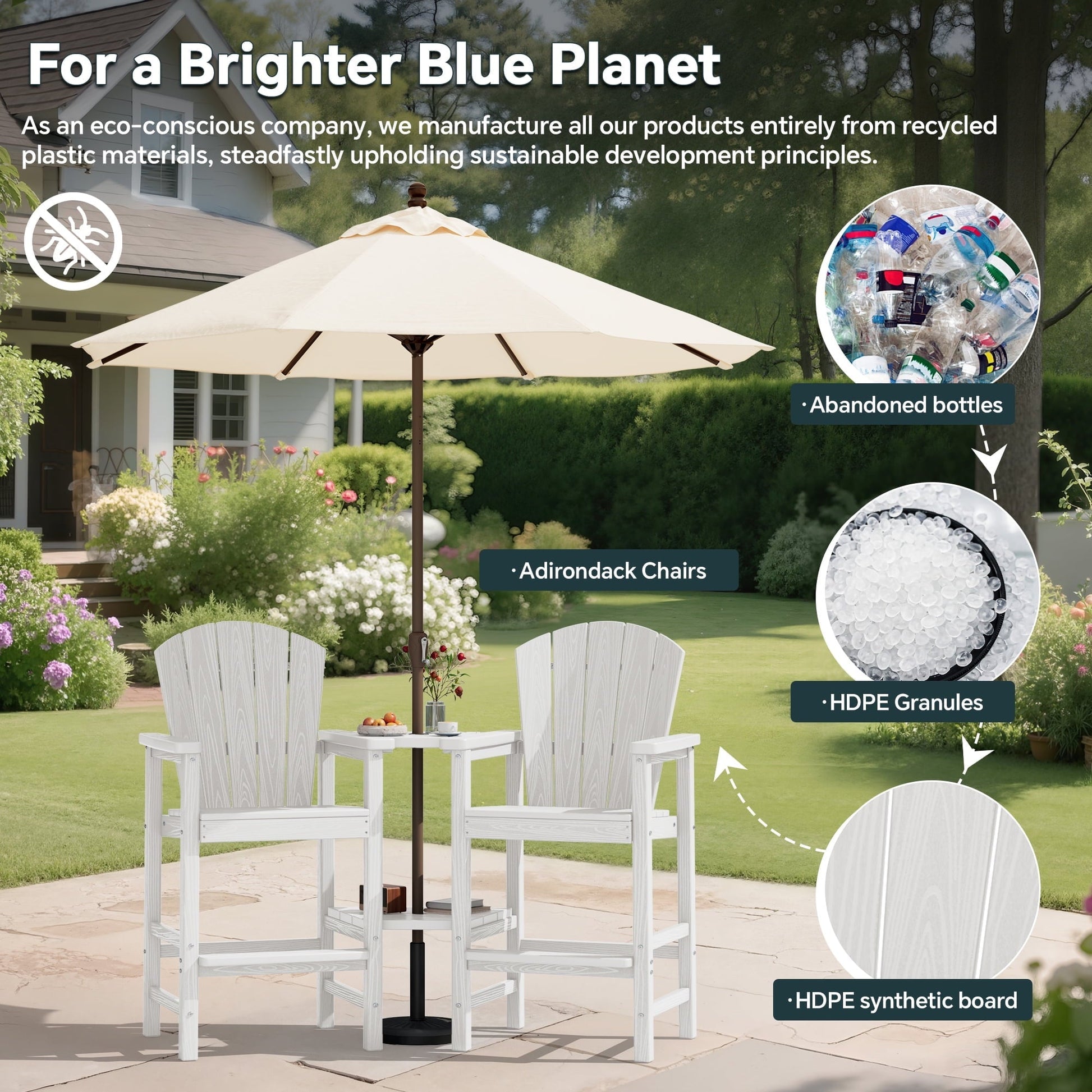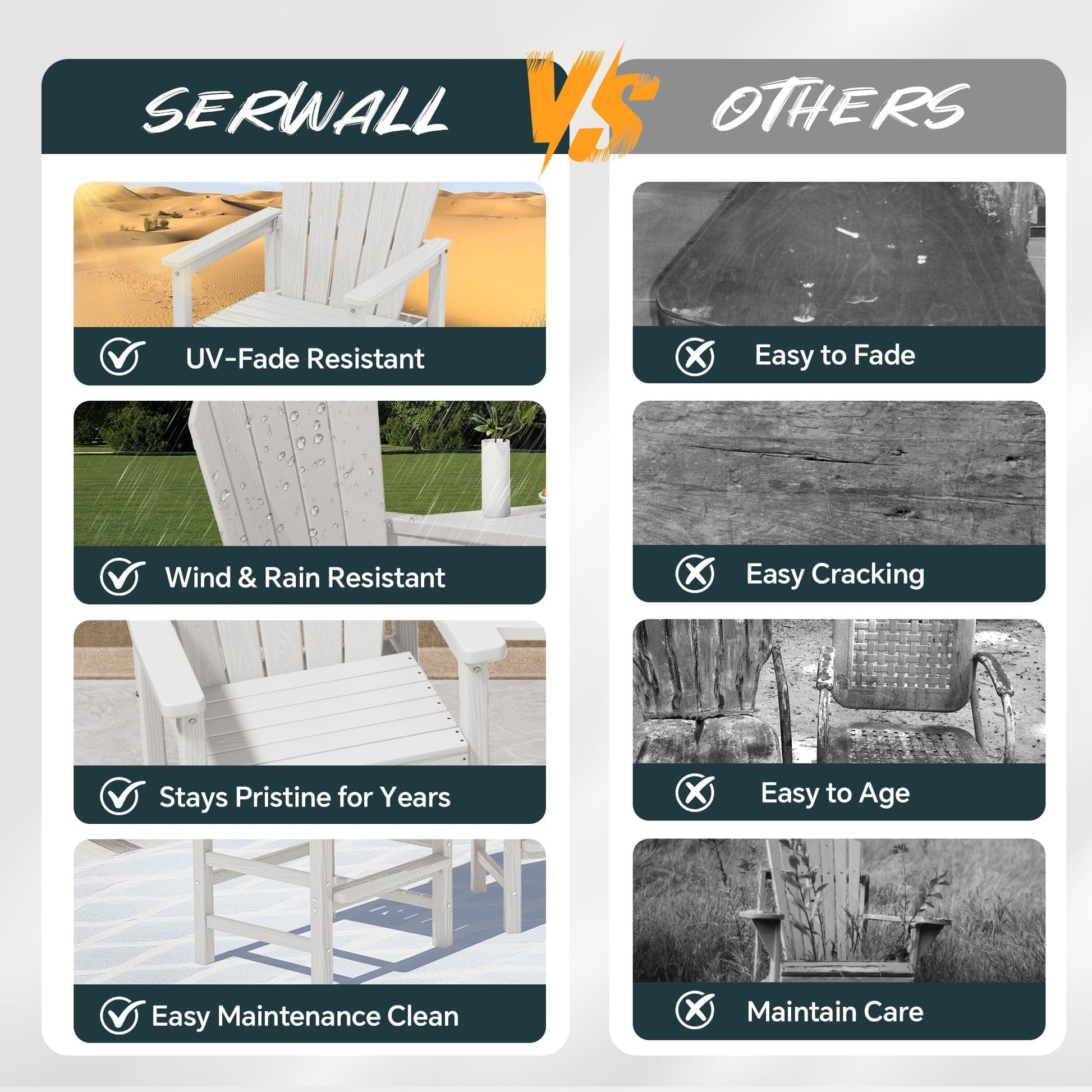 SERWALL Tall Adirondack Chairs are designed for ultimate relaxation, blending timeless charm with modern durability. Crafted from high-density polyethylene (HDPE) and secured with 304 stainless steel hardware, these chairs offer exceptional sturdiness and resilience. Engineered to withstand harsh weather conditions, they resist fading under intense sun exposure and won't rust during heavy rains. Enjoy year-round comfort without the maintenance hassles of traditional wood furniture.The widened seat and 15 degree reclined backrest feature an ergonomic design that elevates your comfort to new heights.