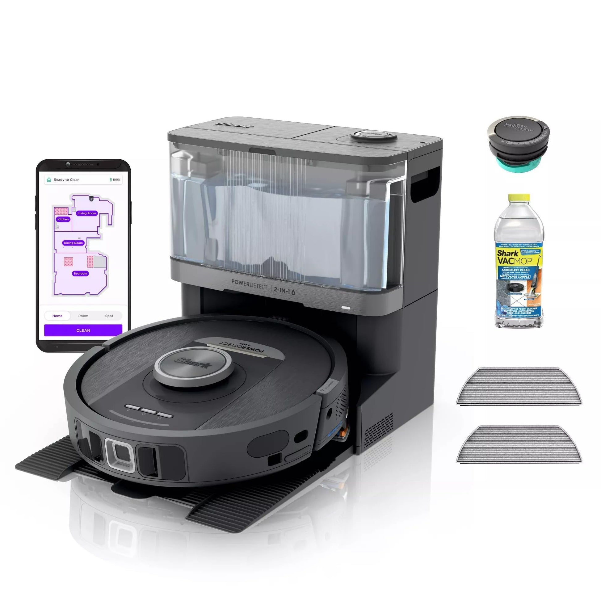 - WHAT’S INCLUDED: PowerDetect Robot, NeverTouch Pro Base, 2 Odor Neutralizer Technology Cartridges, 3 Mopping Pads, 2 Side Brushes, 12 oz. bottle of Shark Multi-Surface Cleaner.