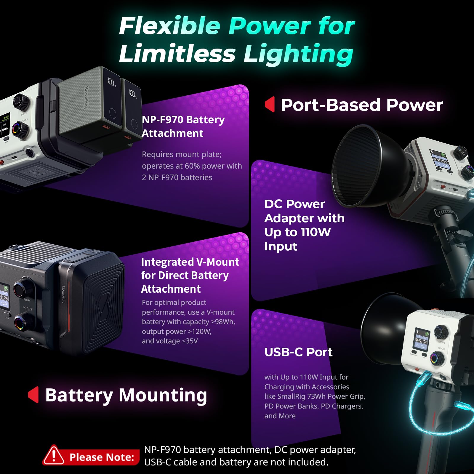 - Complete Accessory Solution: A comprehensive range of accessories is included, fully compatible with SmallRig's mini-mount lighting modifiers (D30, D60, 45x45 softbox, SP-mini spotlight), battery accessories (V-mount and NP-F970 batteries, NP-F battery plates), and mounting accessories (light stand adapters, Bowens mount adapters, magic arms). This provides users with a one-stop solution for portability, convenient power supply, easy control, high-quality light source, and complete accessories
