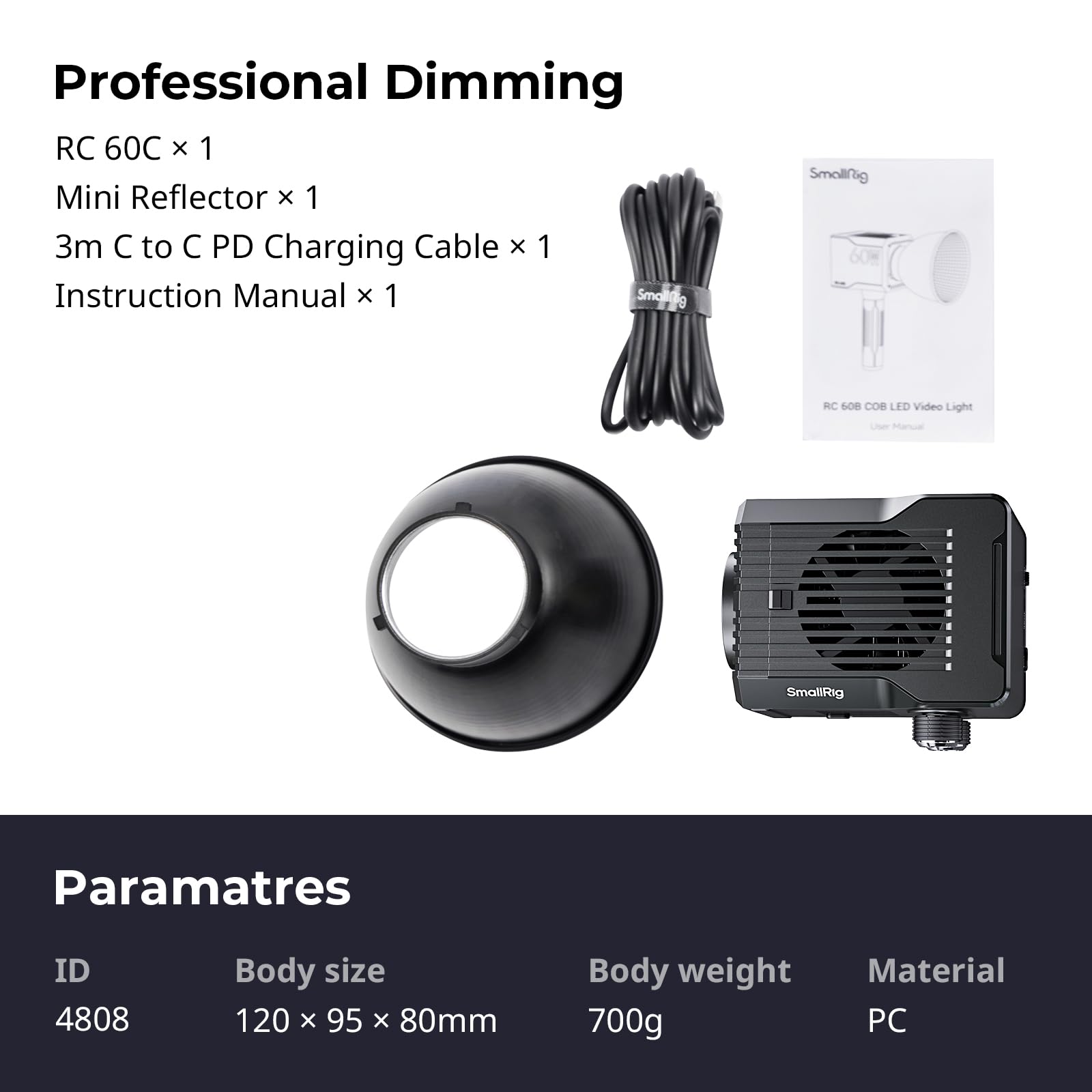 - Package Include:RC 60C x 1, Mini Reflector x 1, 3m C to C PD Charging Cable x 1. Note: This product NOT compatible with Bowen mount accessoirs, but is compatible with various accessories of the SmallRig mini mount.