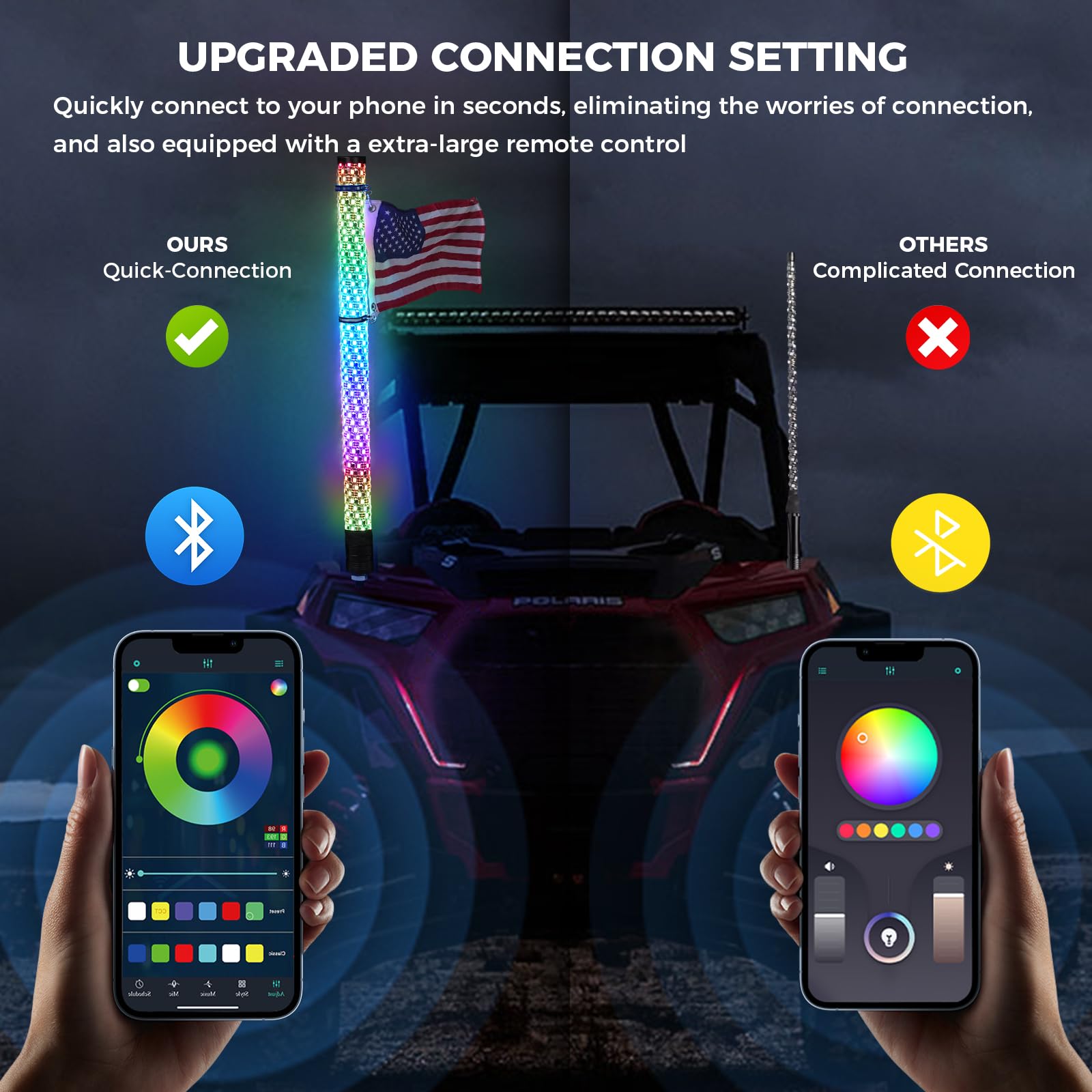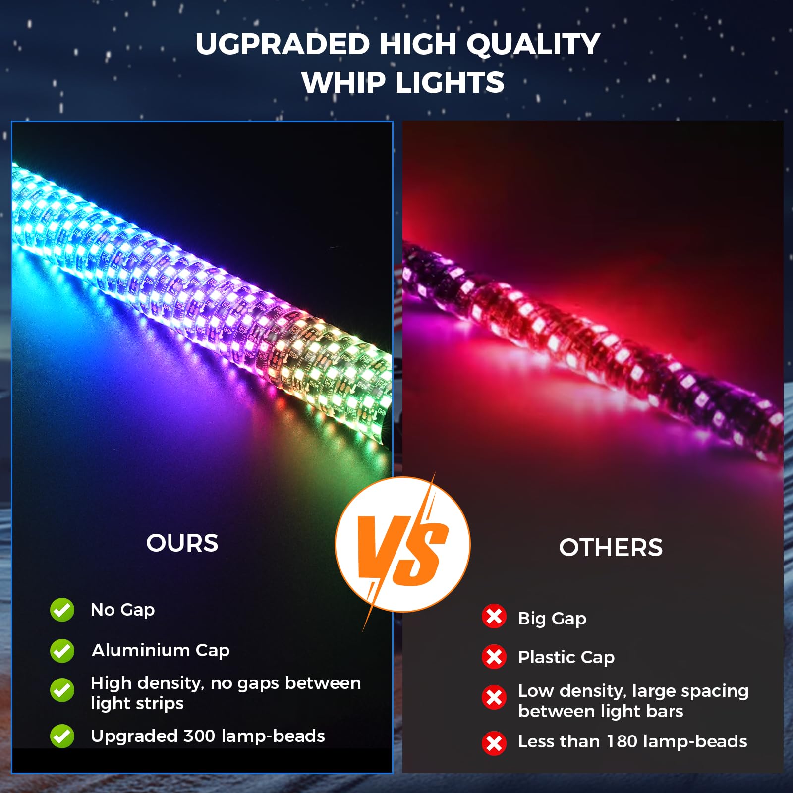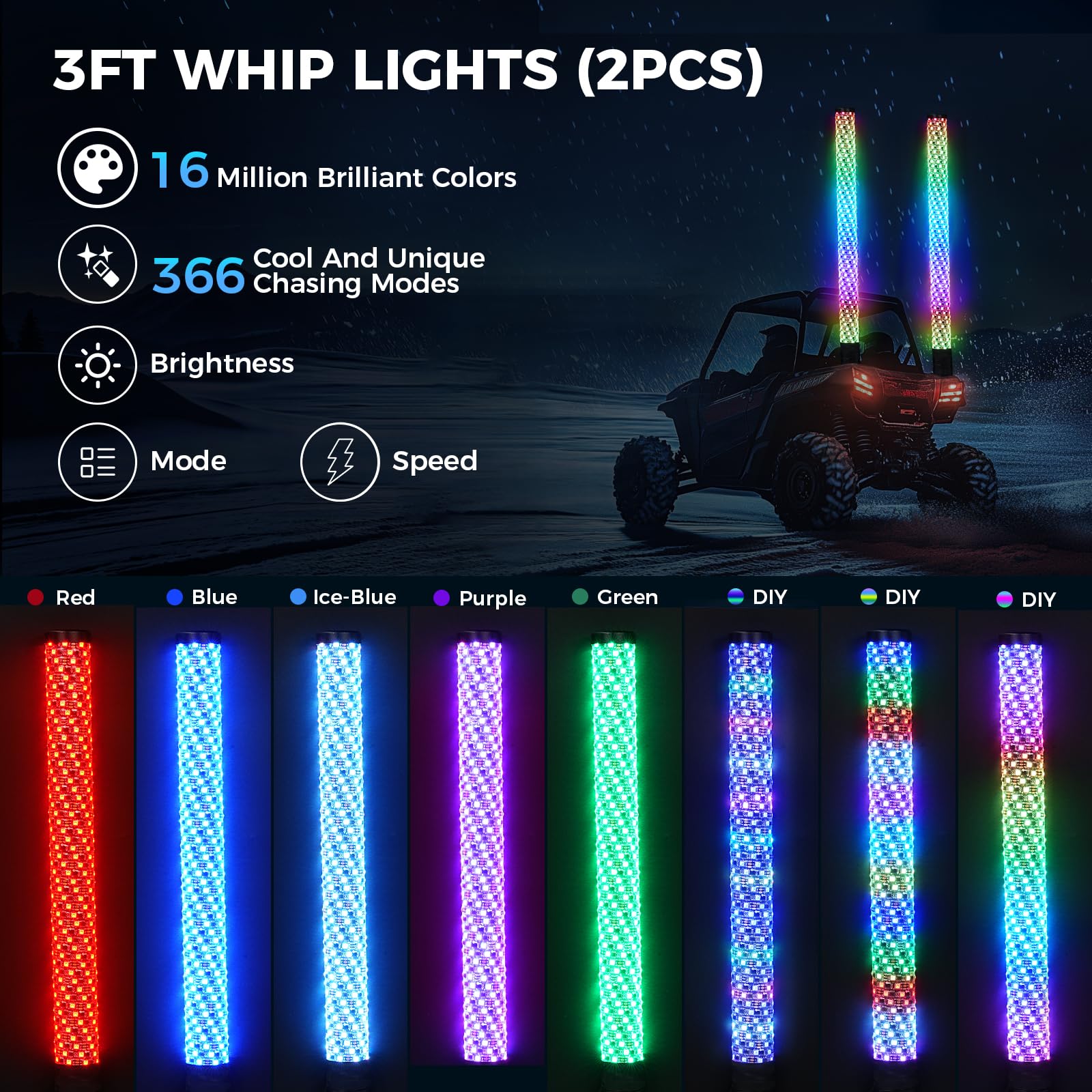 - Easy For Setting: Avoid interference from others' remote controIs by setting your lighted whips into one to one remote controI mode.You can also pair with others when you remove the one to one remote controI mode.Our Whip Light can be fast disassembly,IP67 waterproof and dust-proof,safe and stable performance.This led light whip Can be used as chase light,signal light, warning light,UTV,ATV led light whip,and compatible with CAN-AM,RZR,Side by Side,Polaris,off-road vehicles.