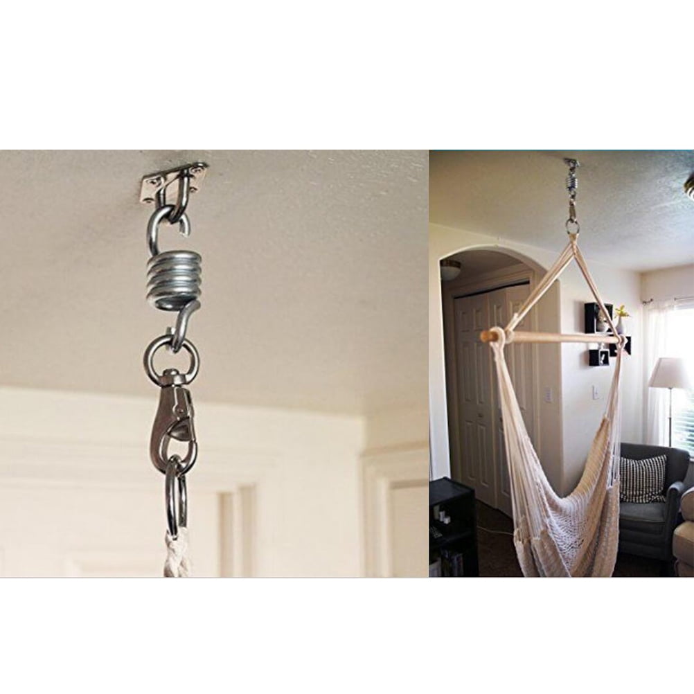This heavy duty spring made of stainless steel is suitable for hanging hammock chairs and other hanging accessories like punching bags, hanging plants, etc. It securely clip onto your swinging chair, let you and without tangling or have to untwist. Low noise, stress and vibration.-hammock chair hanger
