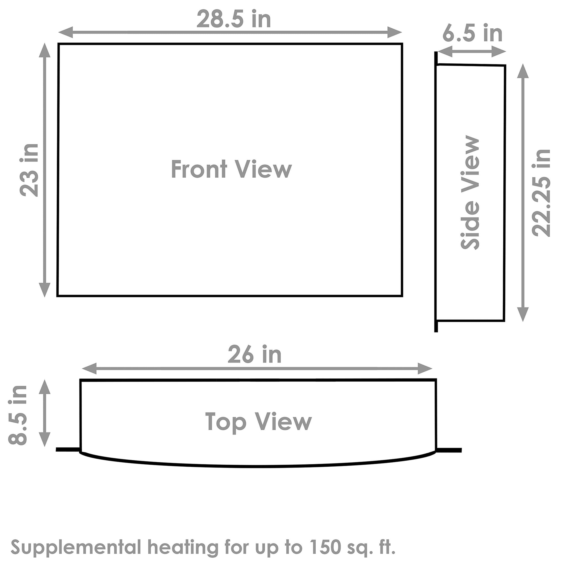 - COZY WARMTH: This fireplace measures 28.5' W x 8.5' D x 23' H. The insert measures 26' W x 6.5' D x 22.25' H. The unit weighs 36.8 lbs. The BTU output is 5,120. The heat settings are 750 W - 1500 W. There is 12.5 amps and 100-127 volts. The cord length is 72 ' L. It provides supplemental heating for up to 150 square feet.