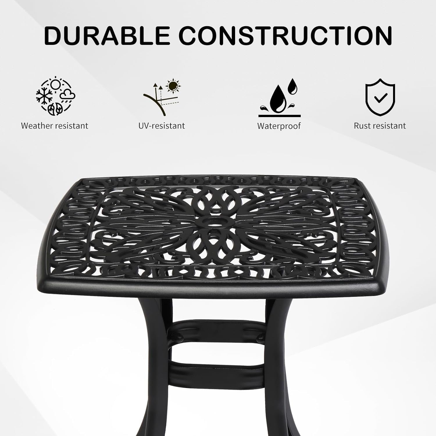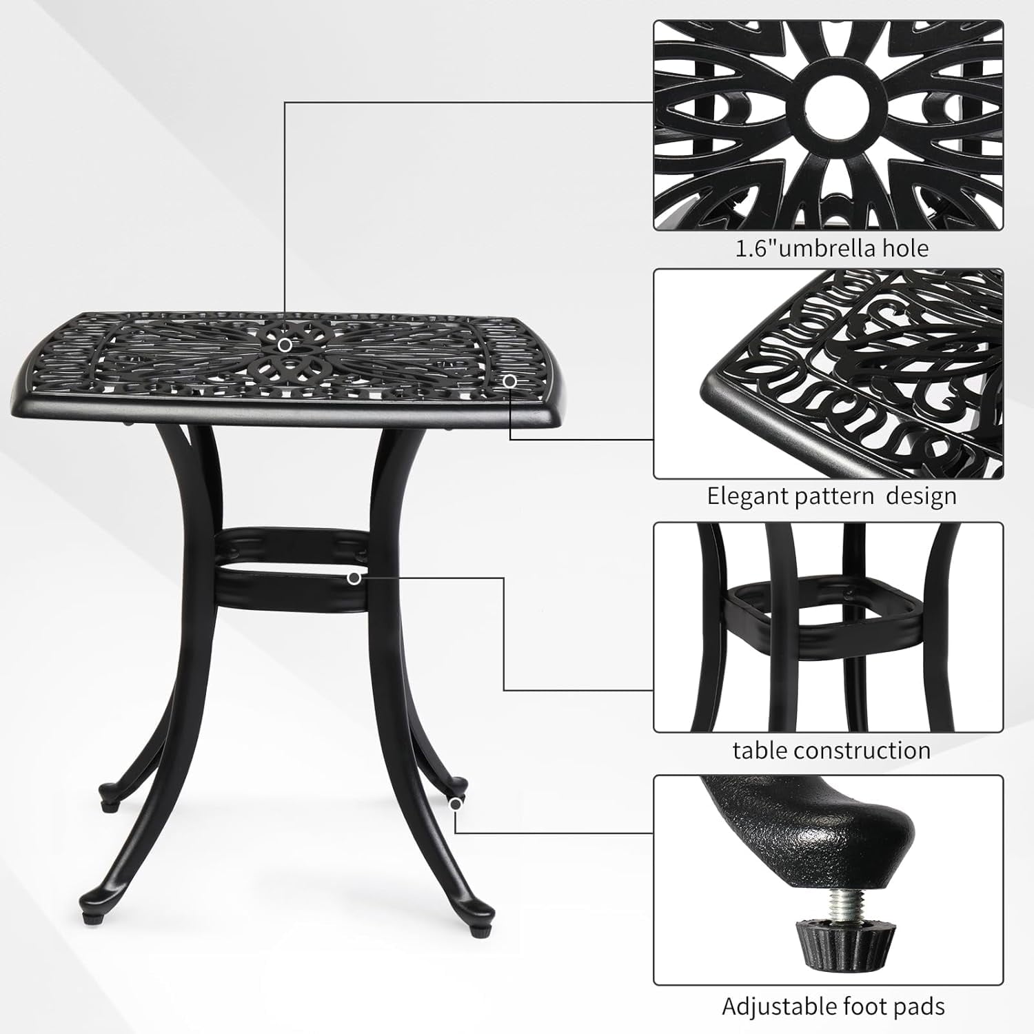 SUPQ 21" Cast Aluminum Patio Table with Umbrella Hole - All Weather, Porch End Table (Black),Square