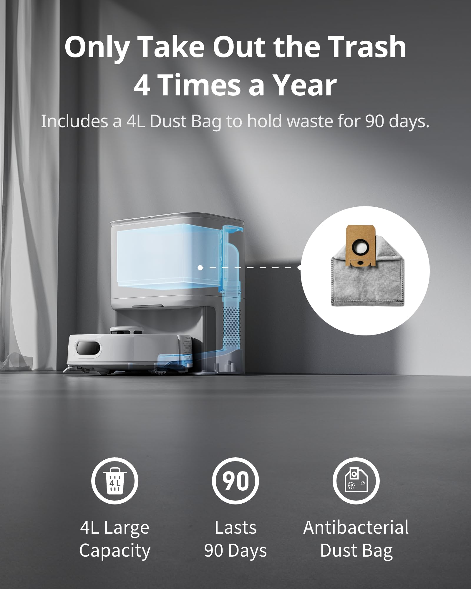 - Empty Trash Only 4 Times a Year: The robot vacuum cleaner K10+ Pro features a 4L dust collection base with a larger capacity than other flagship models. Only needing to be emptied just four times a year, it helps save time and effort, making daily life more convenient