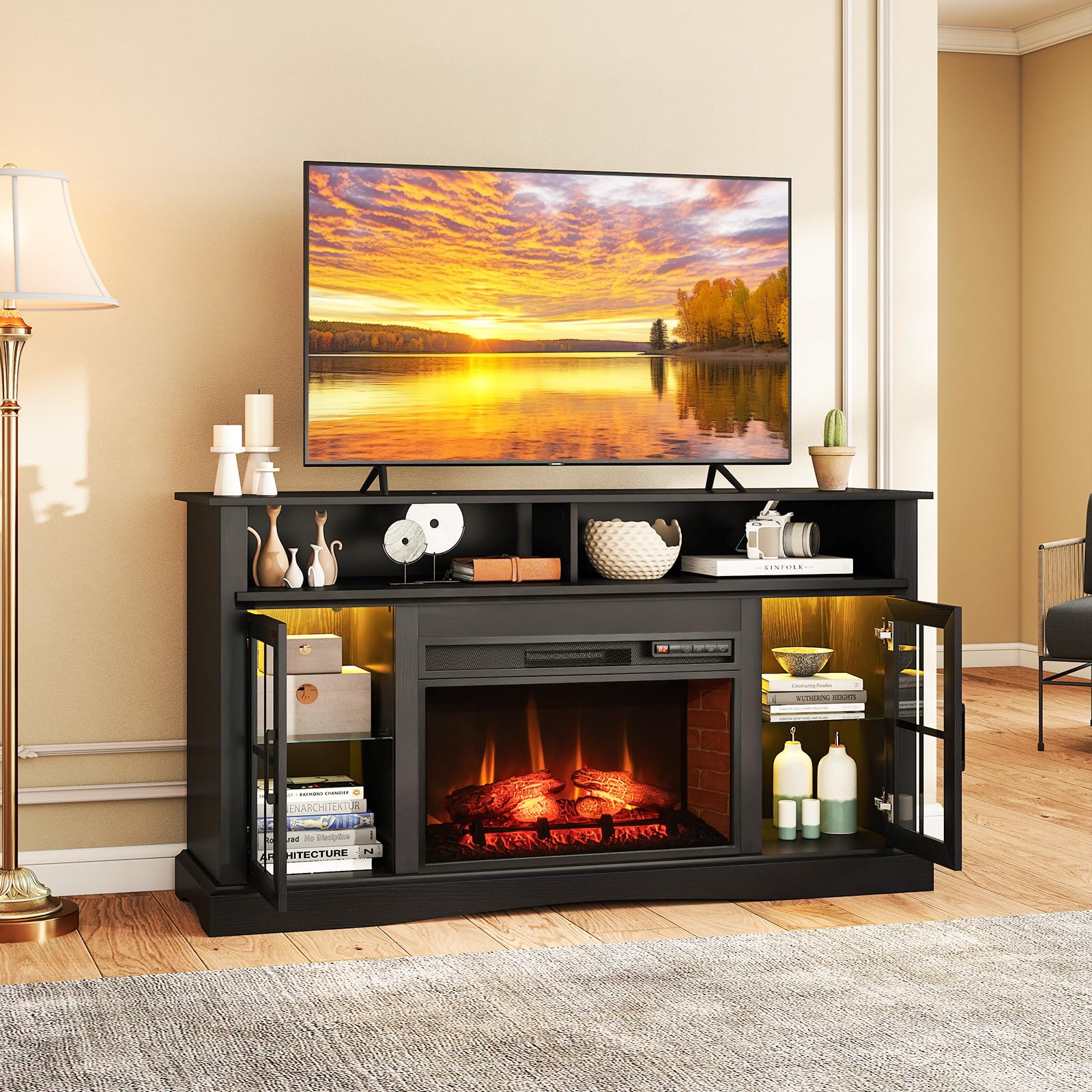 Tangkula Fireplace TV Stand for TVs Up to 65", Adjustable Shelves LED Light Entertainment Center with Electric Fire Place, for Living Room, Bedroom (Black)
