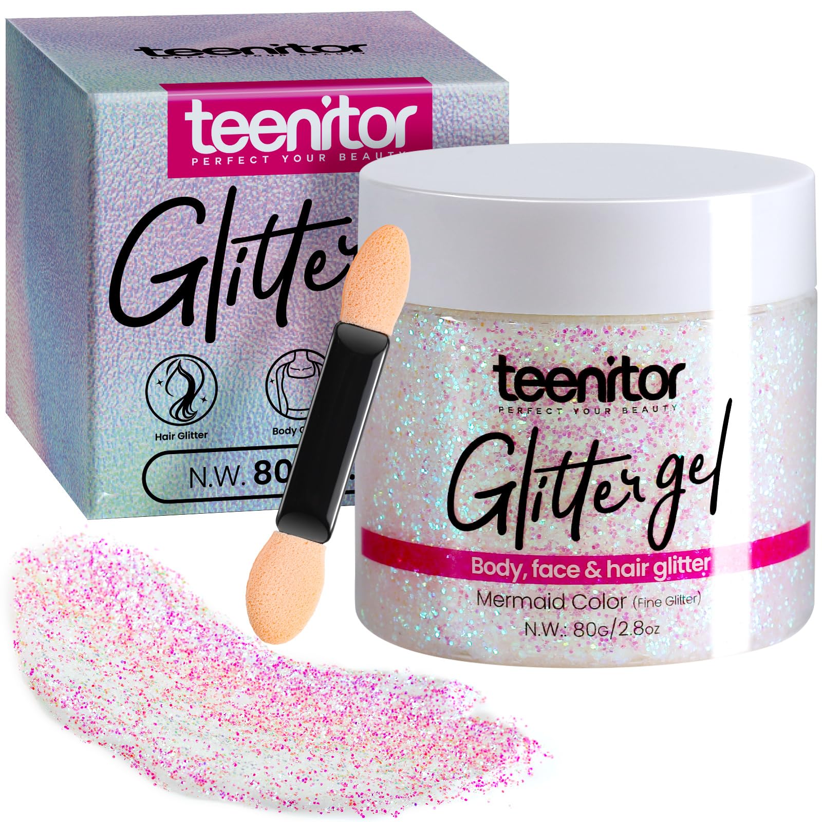 - HOLOGRAPHIC WHITE BODY GLITTER GEL: teenitor body glitter gel is easy to apply and dries quickly. high-quality, water-based formula, safe for skin. Beautiful holographic white glitter creating a stunning sparkle effect. the gel comes in a generous 2.82 ounce bottle, providing you with plenty of product to create your desired look without use of primers or adhesives