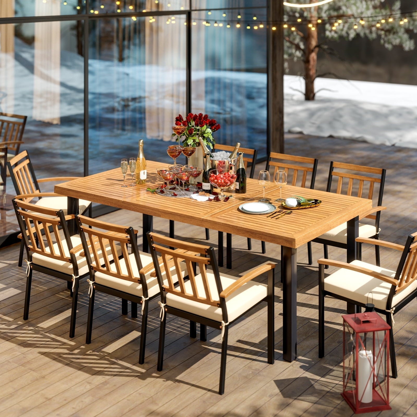 Enjoy outdoor dining in style with this 79' acacia wood dining table. Designed to comfortably seat up to 8 people, the spacious rectangular tabletop provides ample space for family meals, dinner parties, and outdoor gatherings. Crafted from acacia wood, the splinter-free surface showcases a rich natural grain that adds timeless beauty to any setting. Supported by metal legs and adjustable foot pads, this 8-person patio dining table offers exceptional stability. The built-in umbrella hole allows you to easily add shade to outdoor dining area, while the included matching cover keeps the tabletop neat when not in use. Perfect for your backyard, garden, patio, or dining room, this versatile table seamlessly blends elegance and functionality.