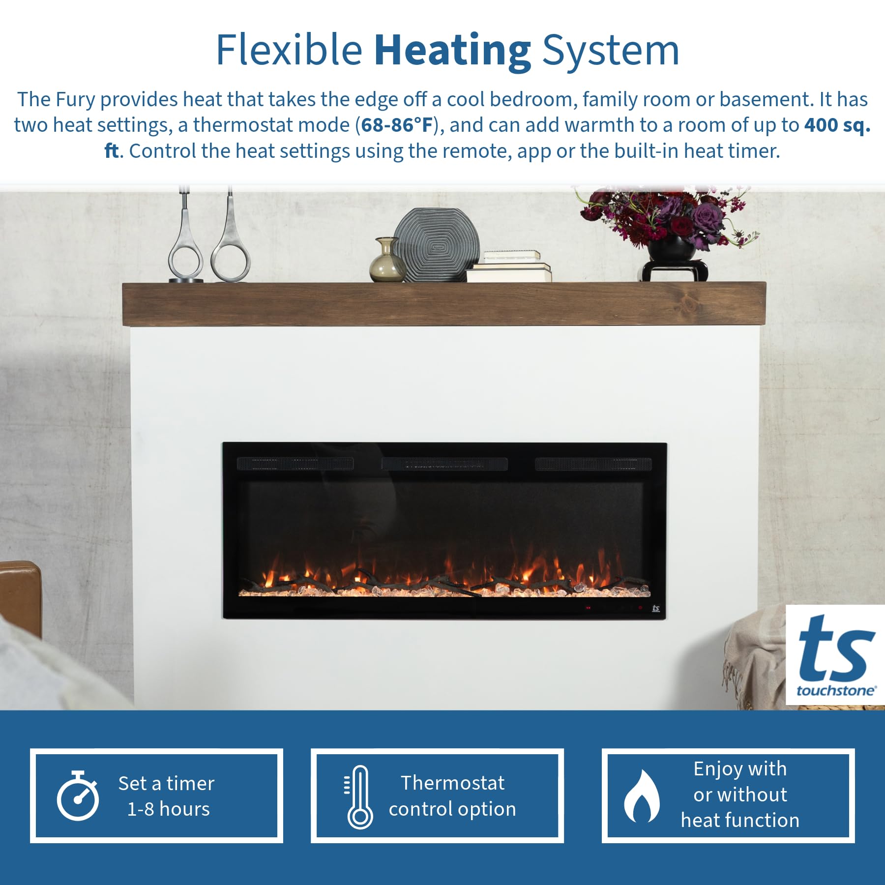 - TV-FRIENDLY AESTHETICS: Touchstone crafted the Fury line to seamlessly match popular flat-screen TV sizes. This 57 inch wide model visually complements most 65 inch TVs. Fury's sleek 4.25-inch depth makes in-wall installation under your TV easier than ever. Minimum of 8” of space between the top of the fireplace and your TV is recommended.