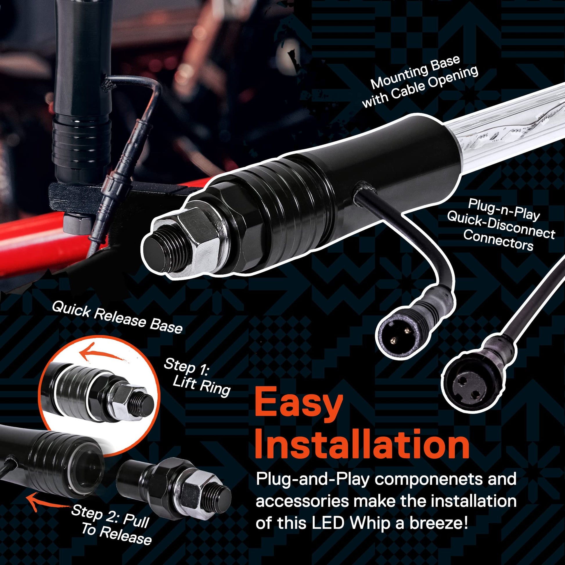 - EASY INSTALLATION - Forget having to run around piecing together components to make your new lights work, these 2 piece offroad 12 volt DC LED antenna whip lights come with easy to install Plug-n-Play components whose installation is made even easier with the supplied installation guide and accessories.