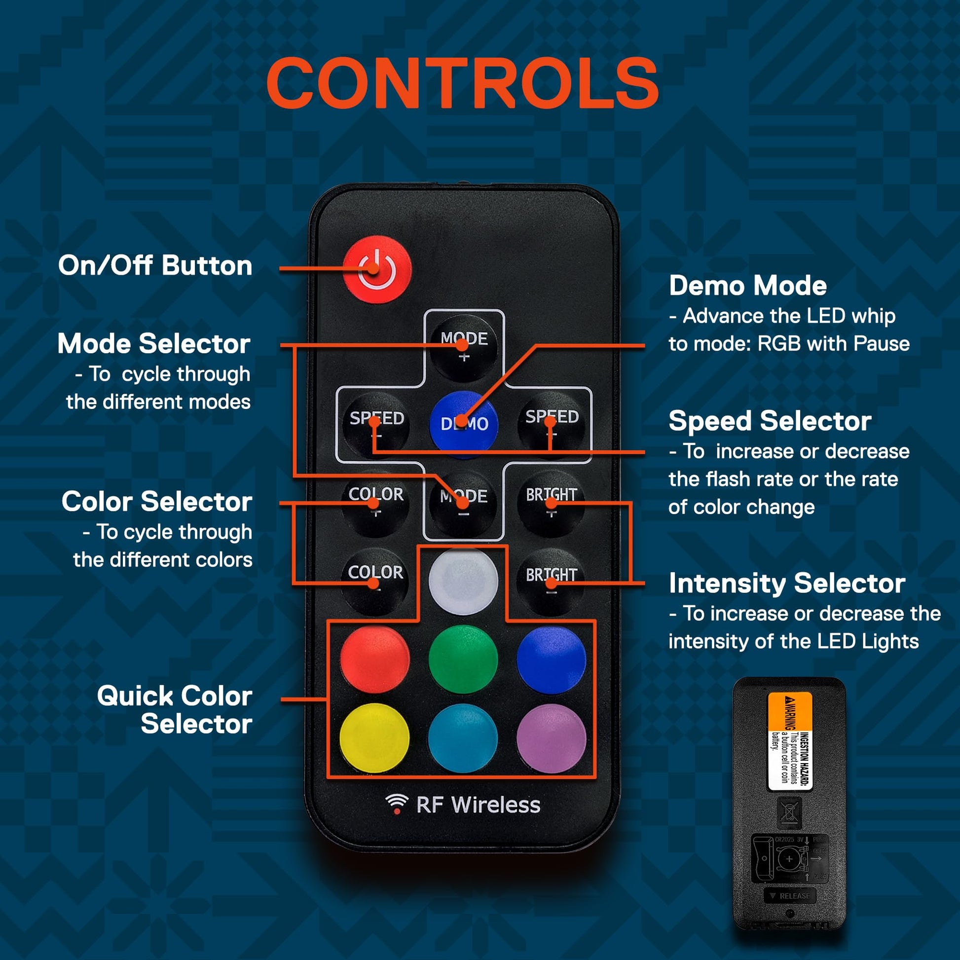 - REMOTE CONTROL - Adjust your 12V battery LED light whips' color shade, color brightness levels, and color flashing speeds wirelessly with the easy to use, supplied remote control. Control multiple COB (Chip on Board) LED whip light units with the same remote whether they're on your truck, car, sand rail, dune buggy, SxS or 4x4.
