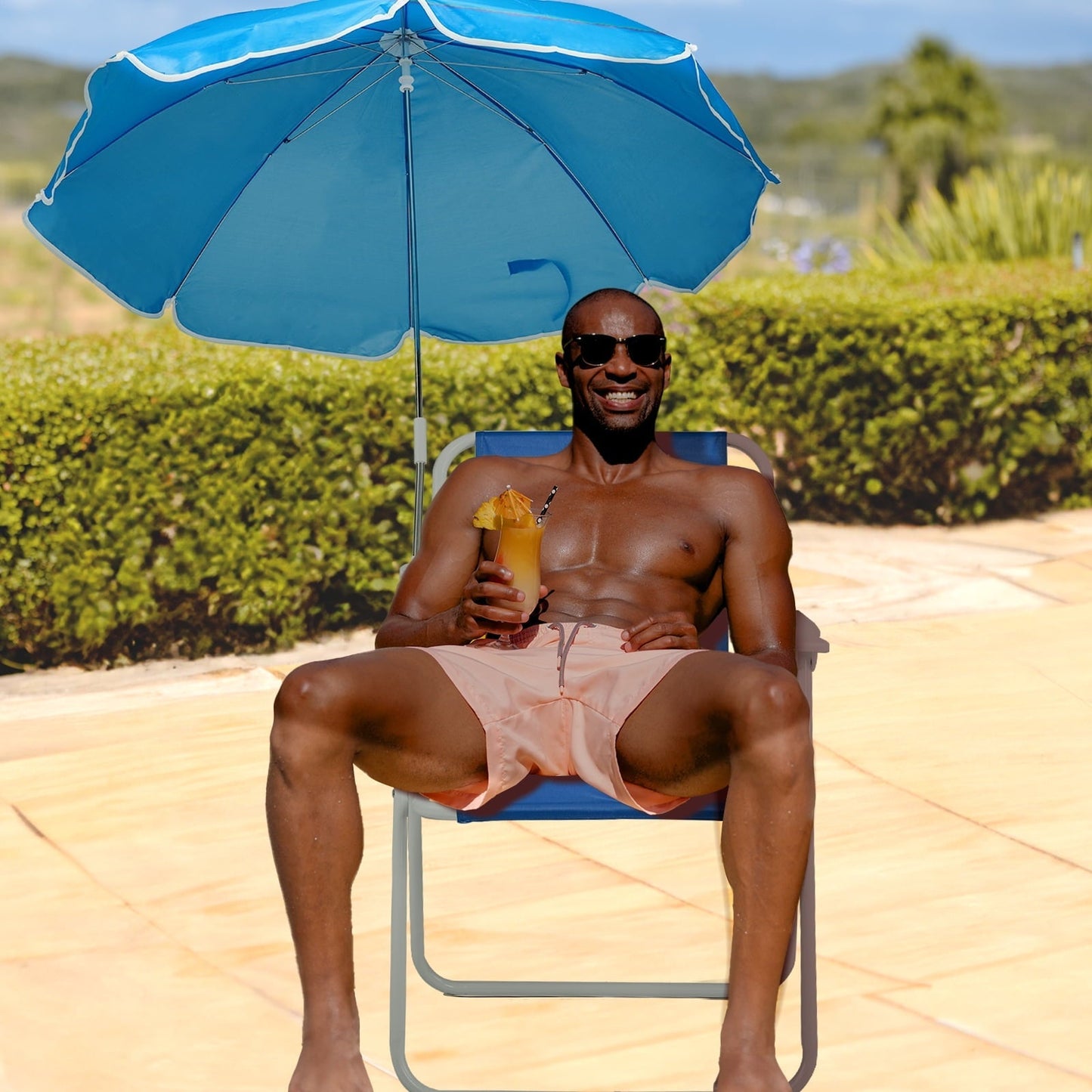 Ideal for outdoors with Folding Beach Chair, this portable camping chair with sun umbrella folds compactly for easy transport to beaches, parks, or campsites. The blue beach chair offers a stylish look while the breathable fabric keeps you cool.