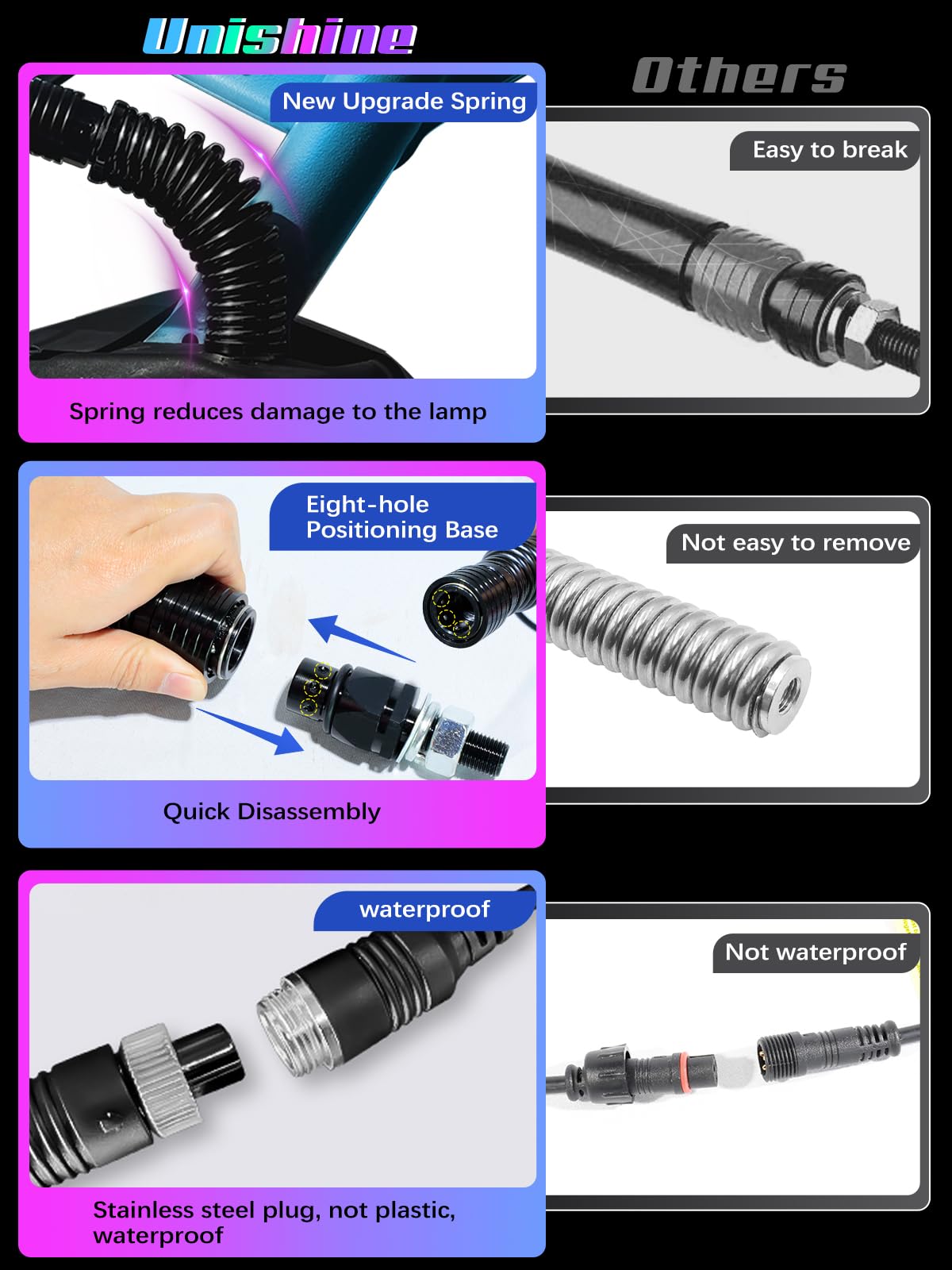 - Note: For 12V DC systems only. A rocker switch is included to help prevent battery drain and protect the whip lights when not in use. Quick-Release Design: Easy to remove when entering garages or to prevent theft. Memory Function: Automatically returns to the last used color after an 8-second white light startup mode.