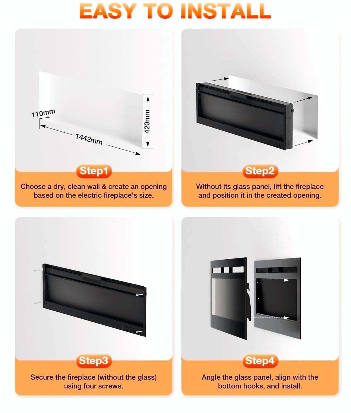 - Easy Installation: We offer various installation methods, including wall-mounted, built-in, and free-standing, to cater to different needs. The product comes with a clear instruction manual, and with simple steps, you can complete the entire installation within an hour.Then, sit back with your loved one and enjoy the lifelike flames