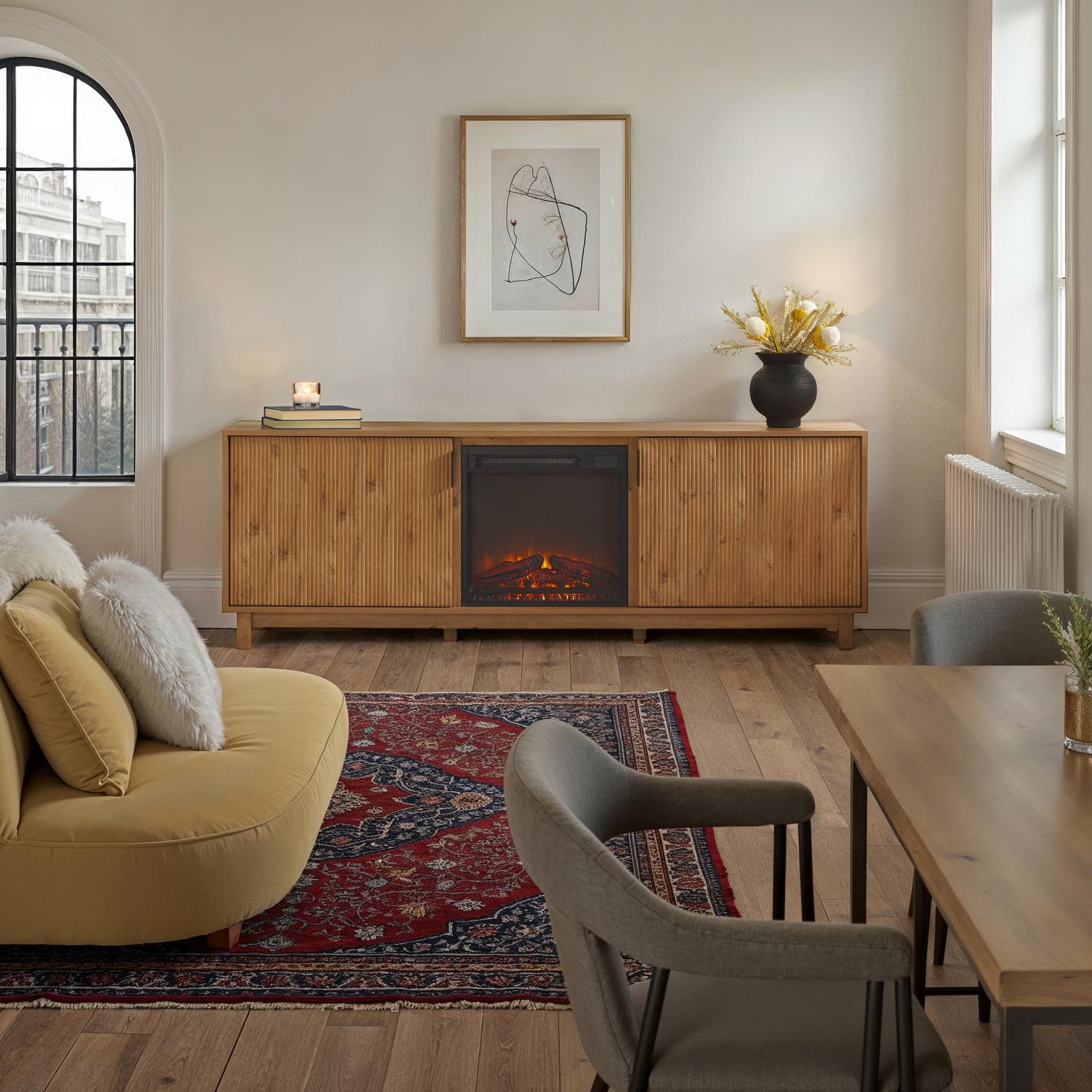 Details: Want the cozy vibes of a fireplace without the hassle? Meet the Modern 70' TV Stand with Freestanding Electric Fireplace: a sleek piece of furniture and a fireplace all in one. Ideal for any season, the 18-inch fireplace insert delivers the welcoming ambiance of a fire, with or without the heat. The convenient remote allows you to adjust the settings from a distance, and the cable management makes it easy to hide pesky cords. Trend-driven reeded door fronts and I-shaped pulls give this two-in-one piece a magazine-worthy look you’ll love showing off in your living space. Best of all, the adjustable shelves offer flexible storage for books, tech devices, media, and more.