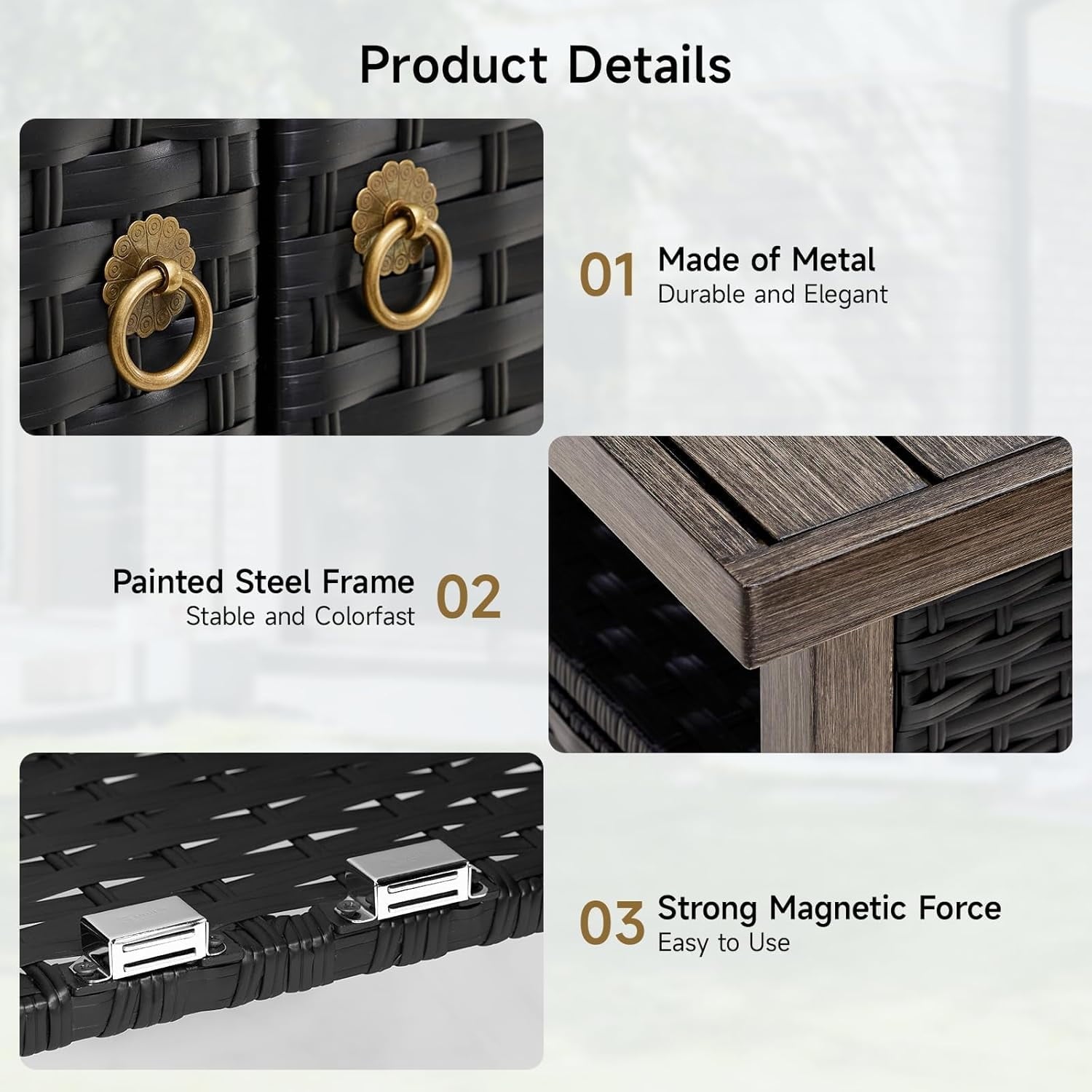 Weatherproof Materials: Rain or shine, this patio cabinet stays elegant! Handwoven PE rattan brings nice texture that resists cracking, paired with a painted steel frame that resist rust and sunburn. Whether on a sunny patio or in a humid environment, rotting and fading are no more. Tough enough for outdoors, chic enough for indoors!