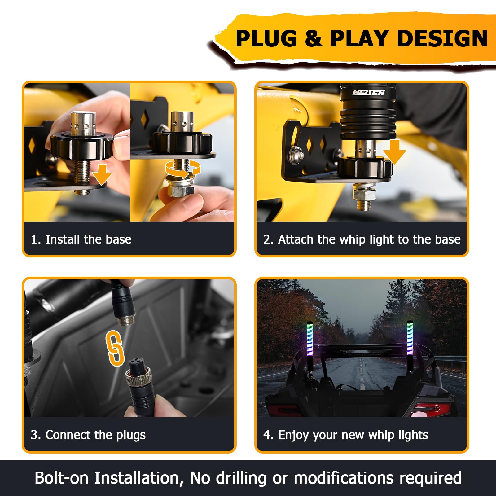 - Easy Installation: Easy to install, our whip lights come with a quick connect and release base on the bottom so you can install or remove the whip light in seconds without drilling or modification. Equipped with plug & play adapters to minimize wiring difficulties.