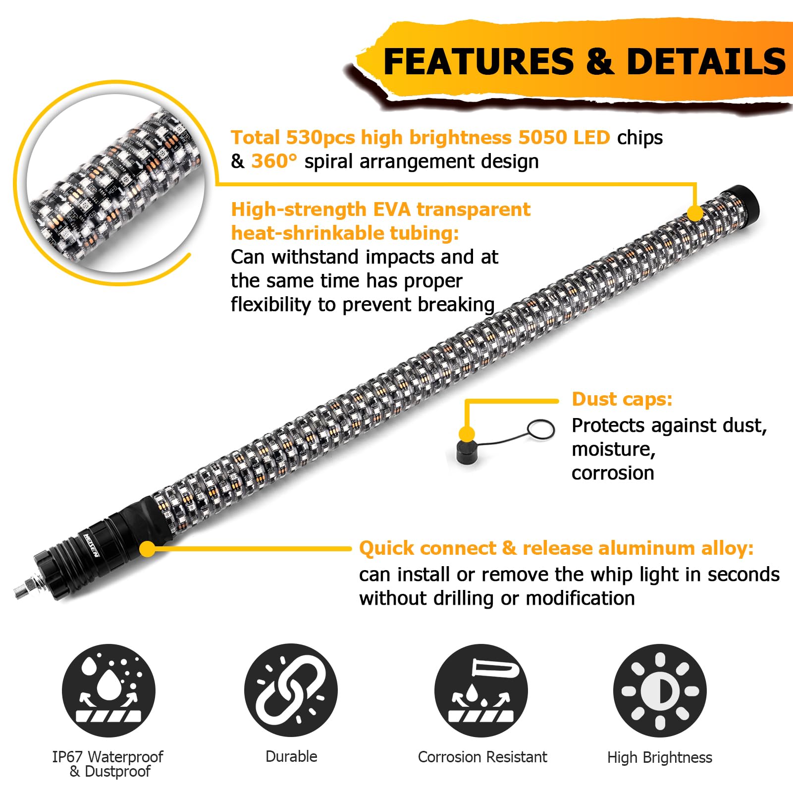 - Upgraded Fat Style: Each whip light has 530pcs leds are arranged in a 360-degree spiral arrangement, compared to the 0.8' diameter on the market, ours is almost 2'. and made of high-strength eva transparent heat-shrinkable tubing, which can withstand impacts and at the same time has proper flexibility to prevent breaking.