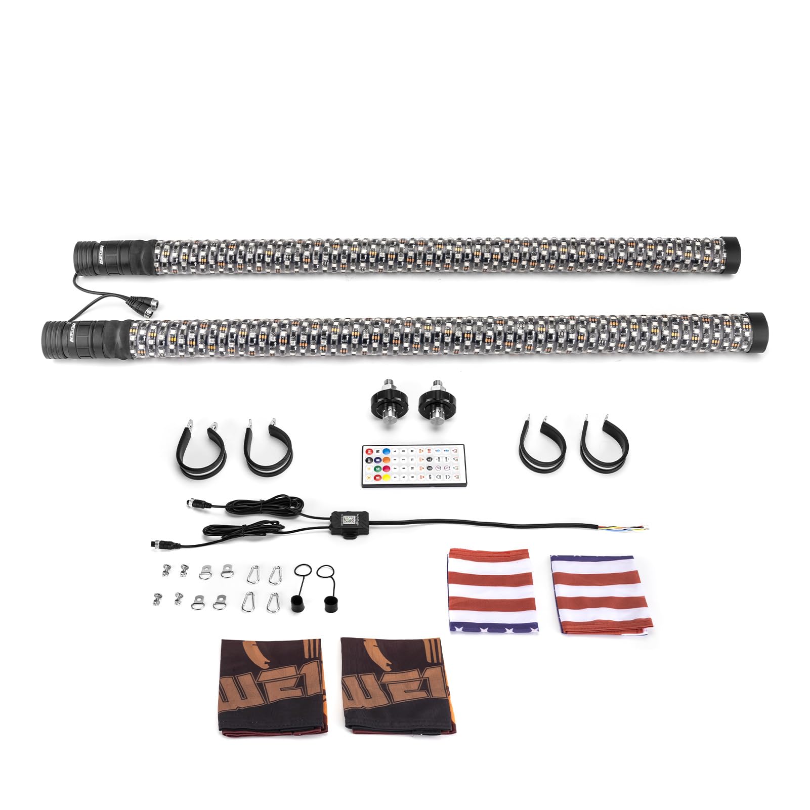 - Package Included: 2 x 3FT Fat LED Whips, 2 x American Flags, 2 x Customized Flags, 2 x Dust Caps, 2 x Extension Wiring Harnesses, 1 x Control Box, 1 x Installation Instructions