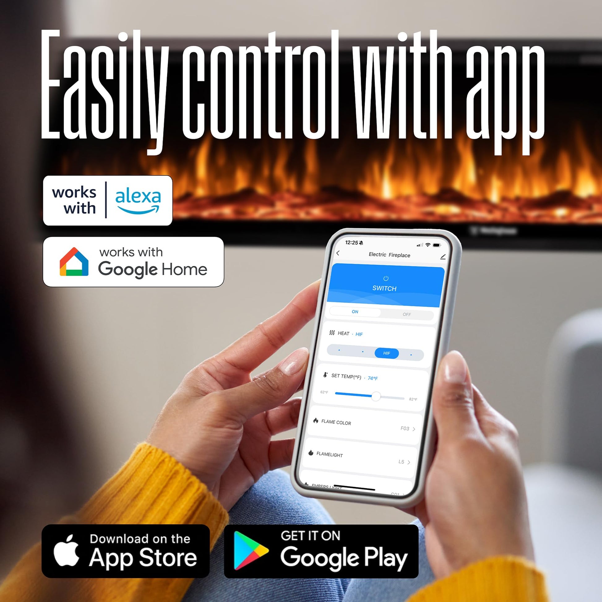 - MULTIPLE CONTROL MODES: Compatible with Alexa and Google Home to elevate your smart home experience. The electric fireplace can also be controlled using the Westinghouse app and the included remote.