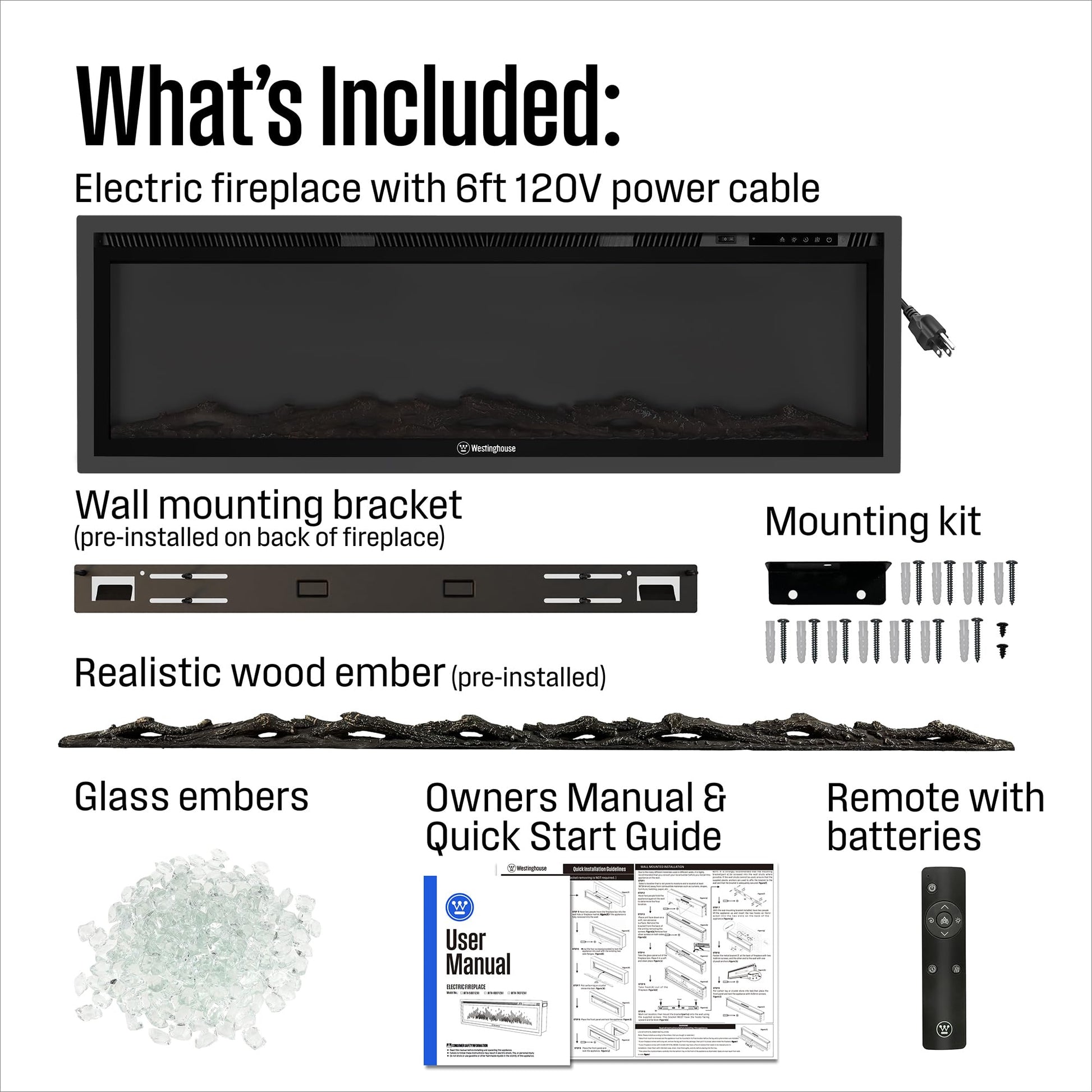 Westinghouse 50 Inch Electric Fireplace Heater, Compatible with Alexa & Google Home, Wall Mount or in-Wall Recessed Fireplace Insert, 24 Hour Timer, Color Changing Flames, 750W/1500W Indoor Heater