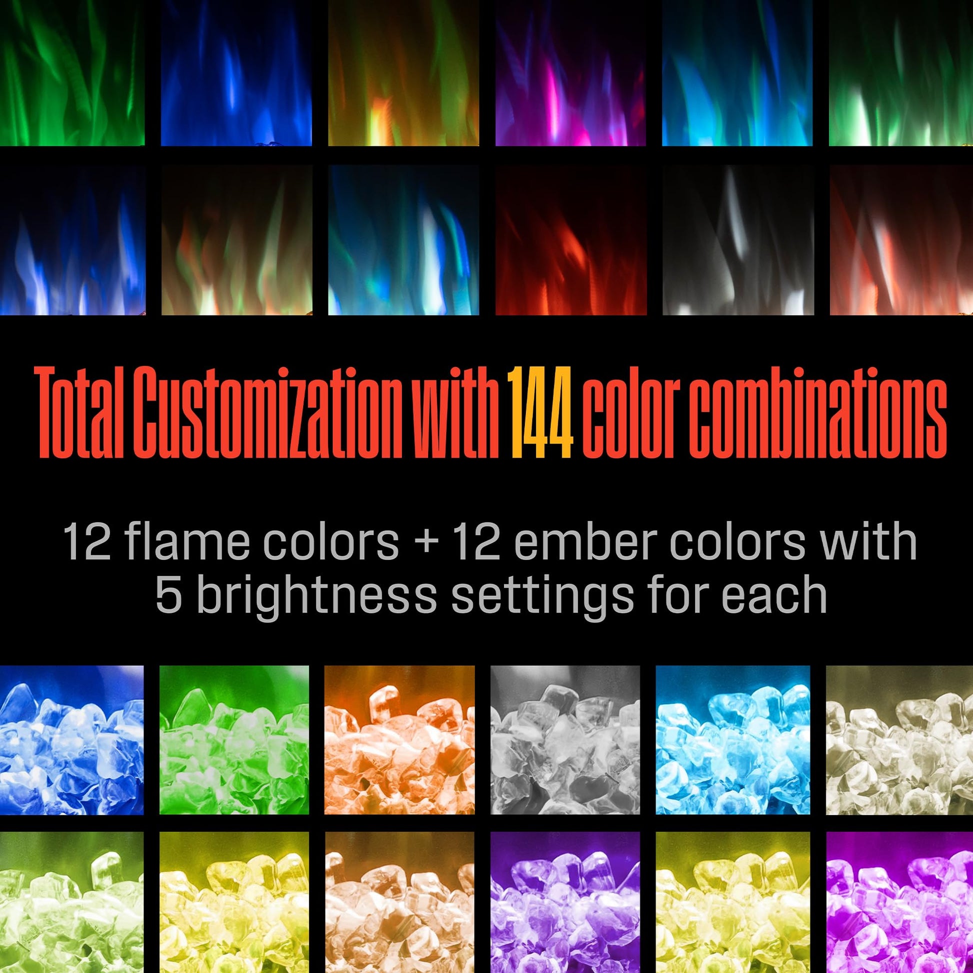 - CUSTOMIZE APPEARANCE: Up to 144 total color combinations for flames and embers, 5 independent brightness levels, and 5 flame burning speeds. Includes interchangeable faux log and crystal ember bed sets for added visual decor.