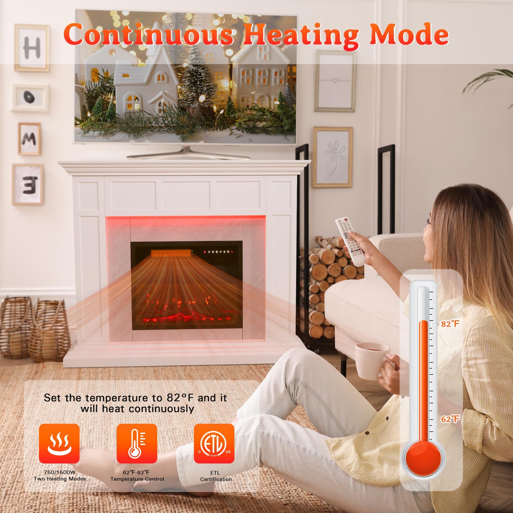 - Energy efficient: The energy efficient 750W-1500W electric fireplace heater has a strong output power, which can bring continuous and stable warmth to your home space. It can effectively heat rooms up to 400 square feet, allowing you to enjoy a warm and cozy environment in the cold season, while avoiding the hassle of smoke and ash from traditional fireplaces, and keeping your home warm and clean at all times.