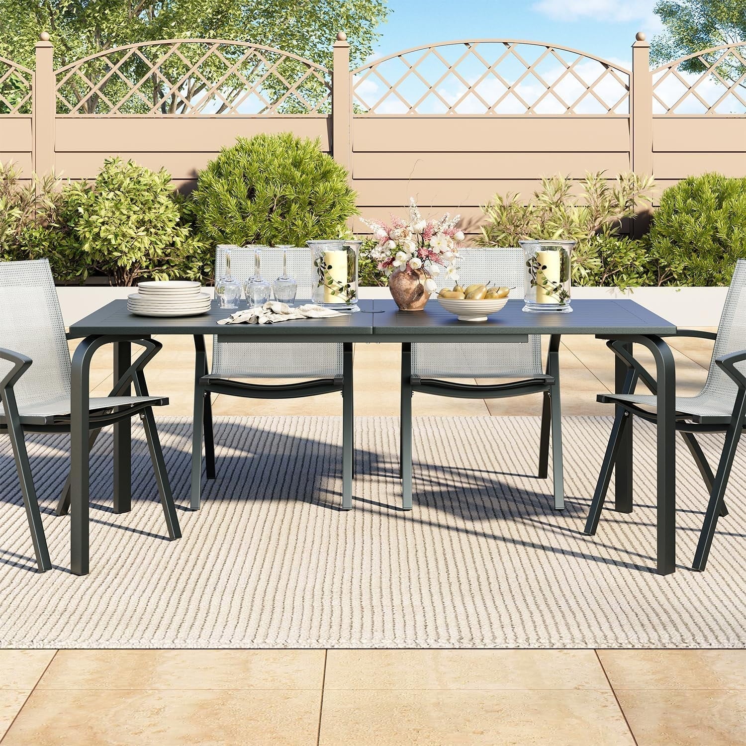 The Wildbreak Outdoor Dining Table is a stylish and practical addition to any patio or backyard. This gray metal table comfortably seats eight people, making it perfect for family gatherings or entertaining guests. Measuring 70.9 inches long, 35 inches wide, and 29 inches high, it offers ample space for food and drinks. The slatted tabletop adds a touch of elegance, while the convenient umbrella hole provides shade on sunny days. Its sturdy construction ensures durability and long-lasting use, making it a worthwhile investment for outdoor dining enjoyment. The simple, yet elegant design complements various outdoor settings.