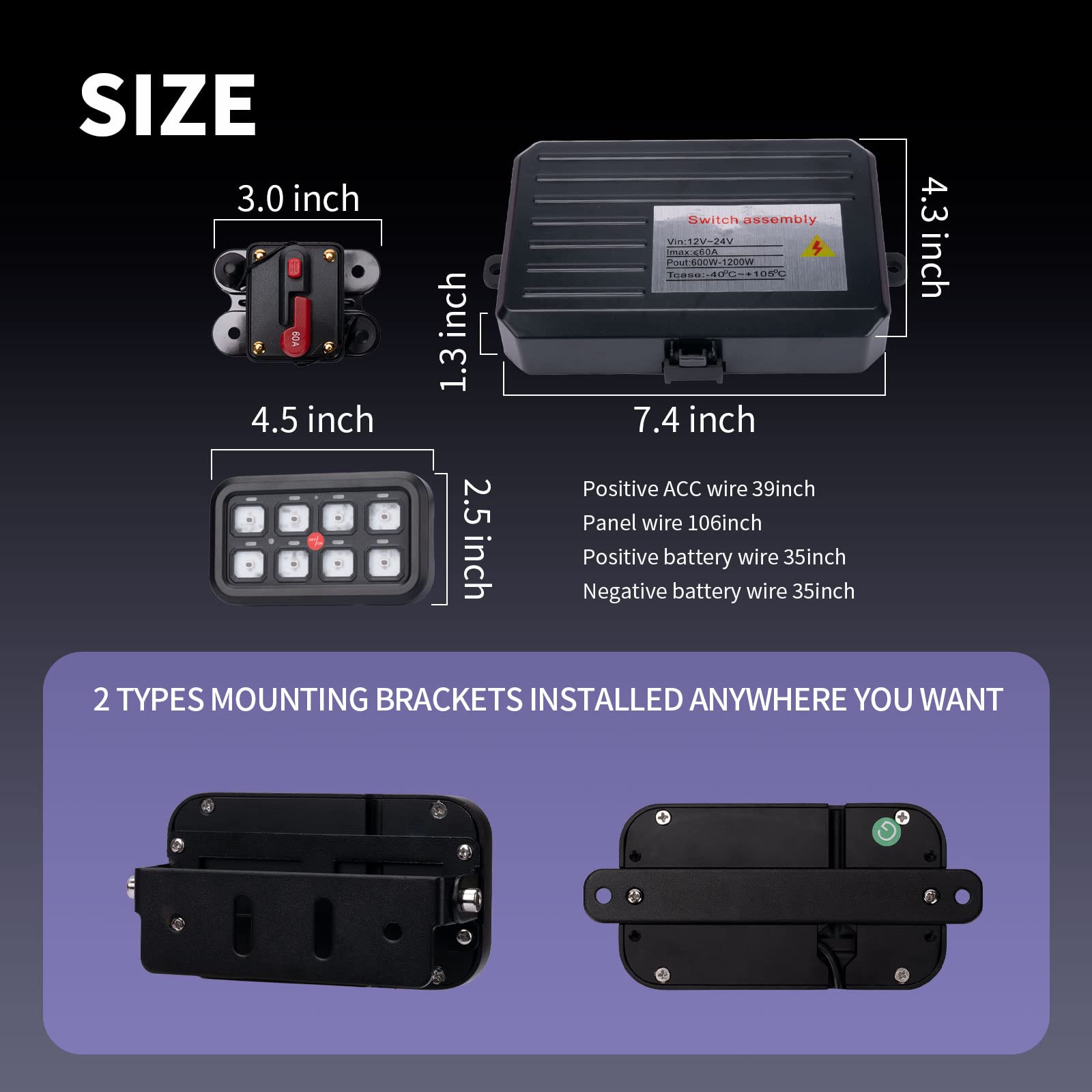 - EASY INSTALLATION - 8 button accessory switch controller contents everything for installation. upgraded accessories like the circuit box built-in solid state relay, Circuit breaker, dust & waterproof covers, 60pcs stickers, two types of mounting bracket, plug and play wiring harness with 10ft extension cable, installation and maintenance are a breeze.