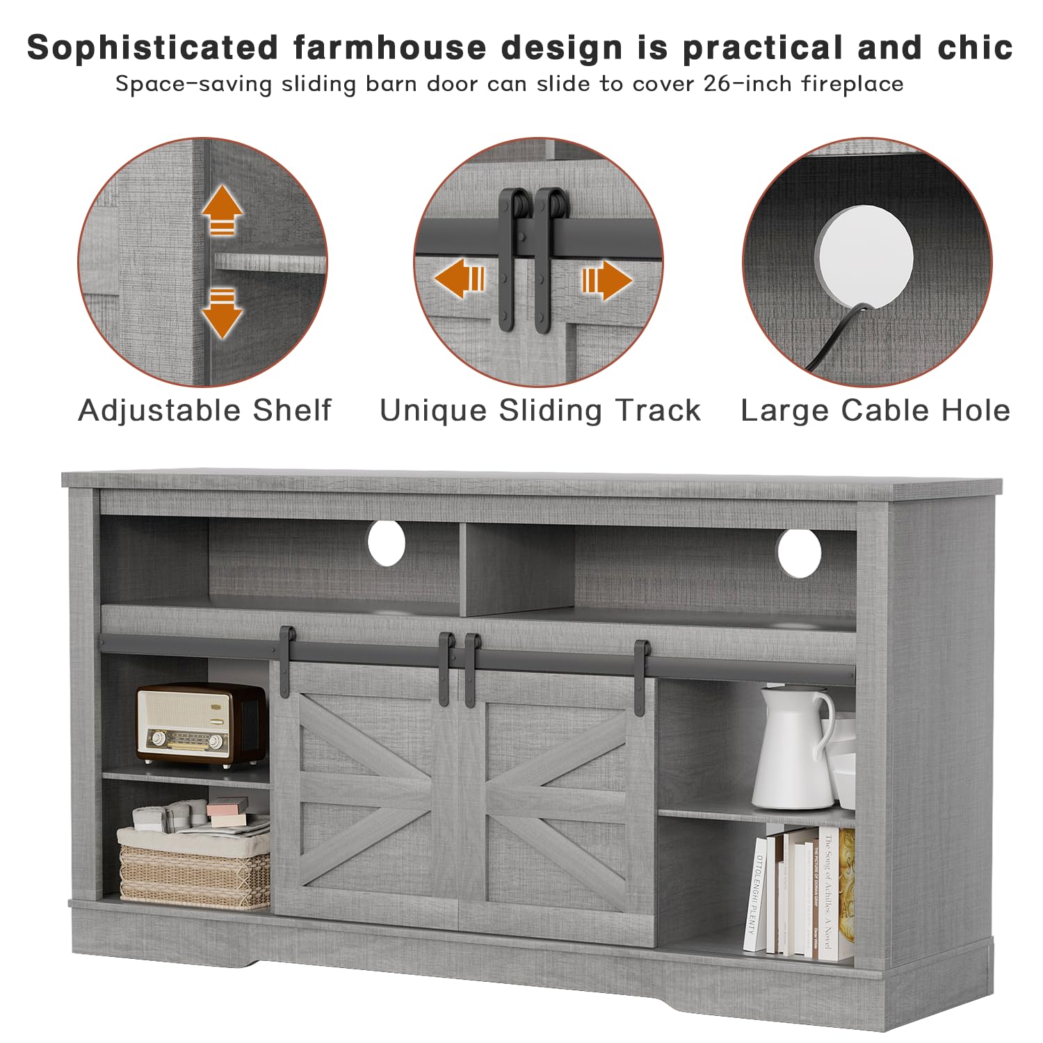 YESHOMY Fireplace TV Stand for Television up to 65+ Inch with Storage and Farmhouse Sliding Barn Doors, Entertainment Center with Cabinet and Shelves, Media Console for Living Room, Gray